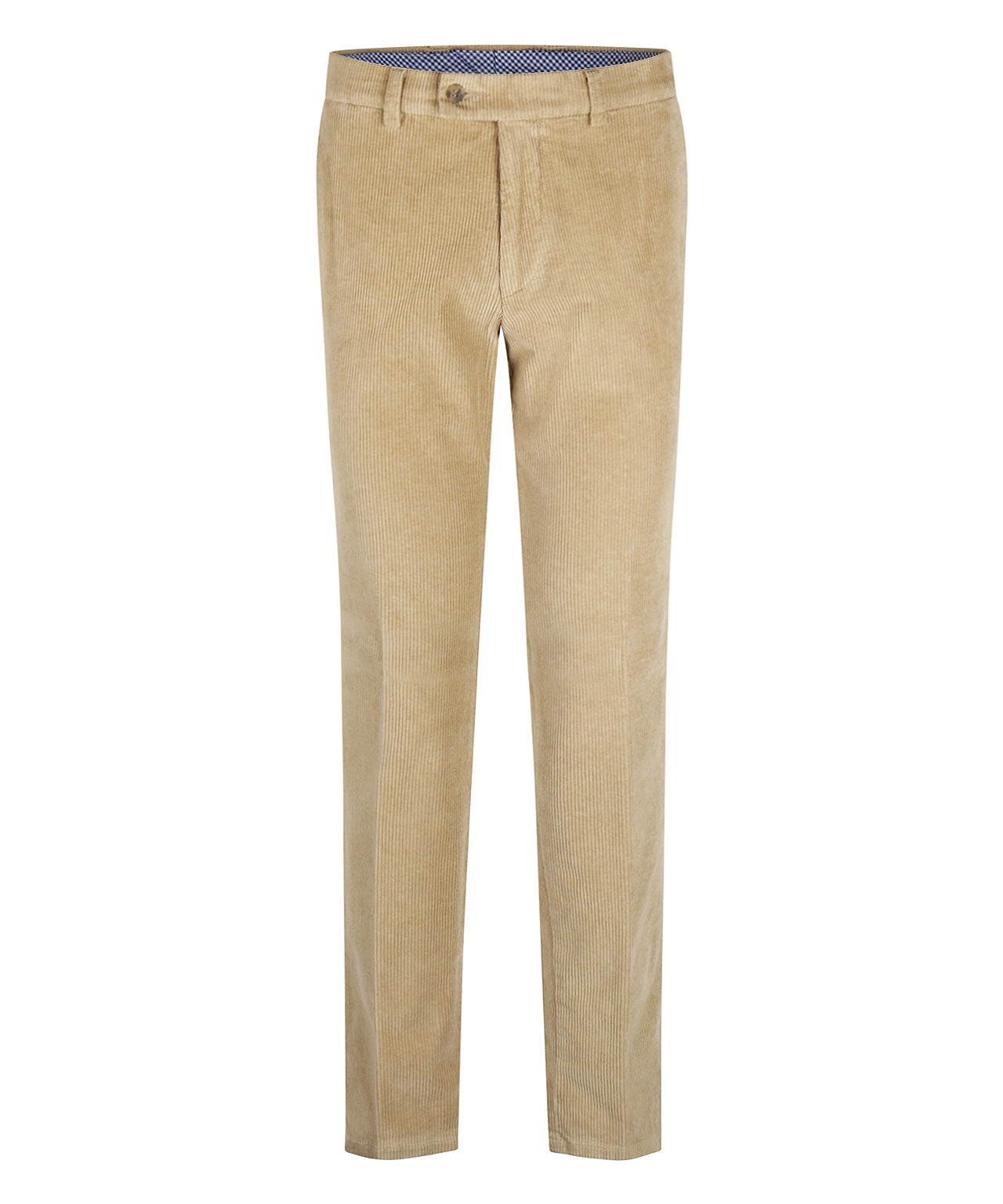 Classic corduroy wide rib trousers without pleats and turn-ups. The trousers have deep pockets and loops around the waist for a belt. The pockets on the back have buttons. The trousers are made of 97% cotton with 3% elastane for a comfortable fit.