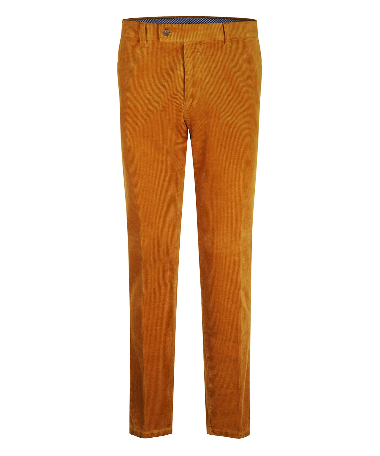 Classic corduroy wide rib trousers without pleats and turn-ups. The trousers have deep pockets and loops around the waist for a belt. The pockets on the back have buttons. The trousers are made of 97% cotton with 3% elastane for a comfortable fit.