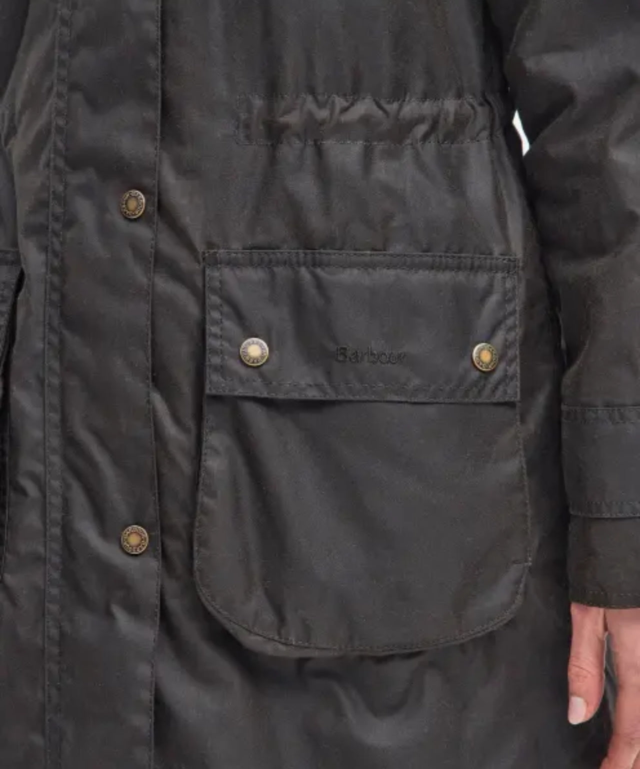 De Barbour Long Cannich Wax Jacket heeft een langer model met een membraaninzetstuk voor optimaal comfort en warmte. Met een vissenstaartzoom voor vrouwelijke details en een vaste capuchon voegt dit jack een onwrikbare stijl toe met behoud van essentiële functionaliteit. Met twee lagere traditionele zakken voor handige opbergruimte is dit jack afgewerkt met een subtiele branding op de linkerzak. Binnenvoering: 65% polyester, 35% katoen.