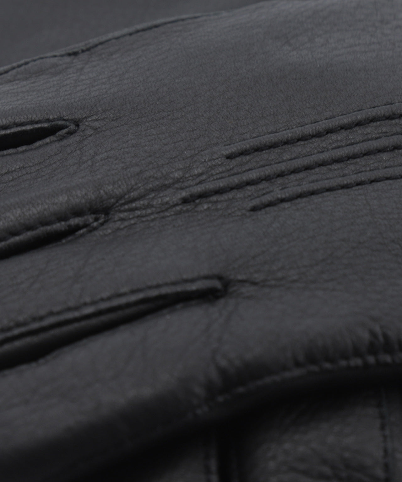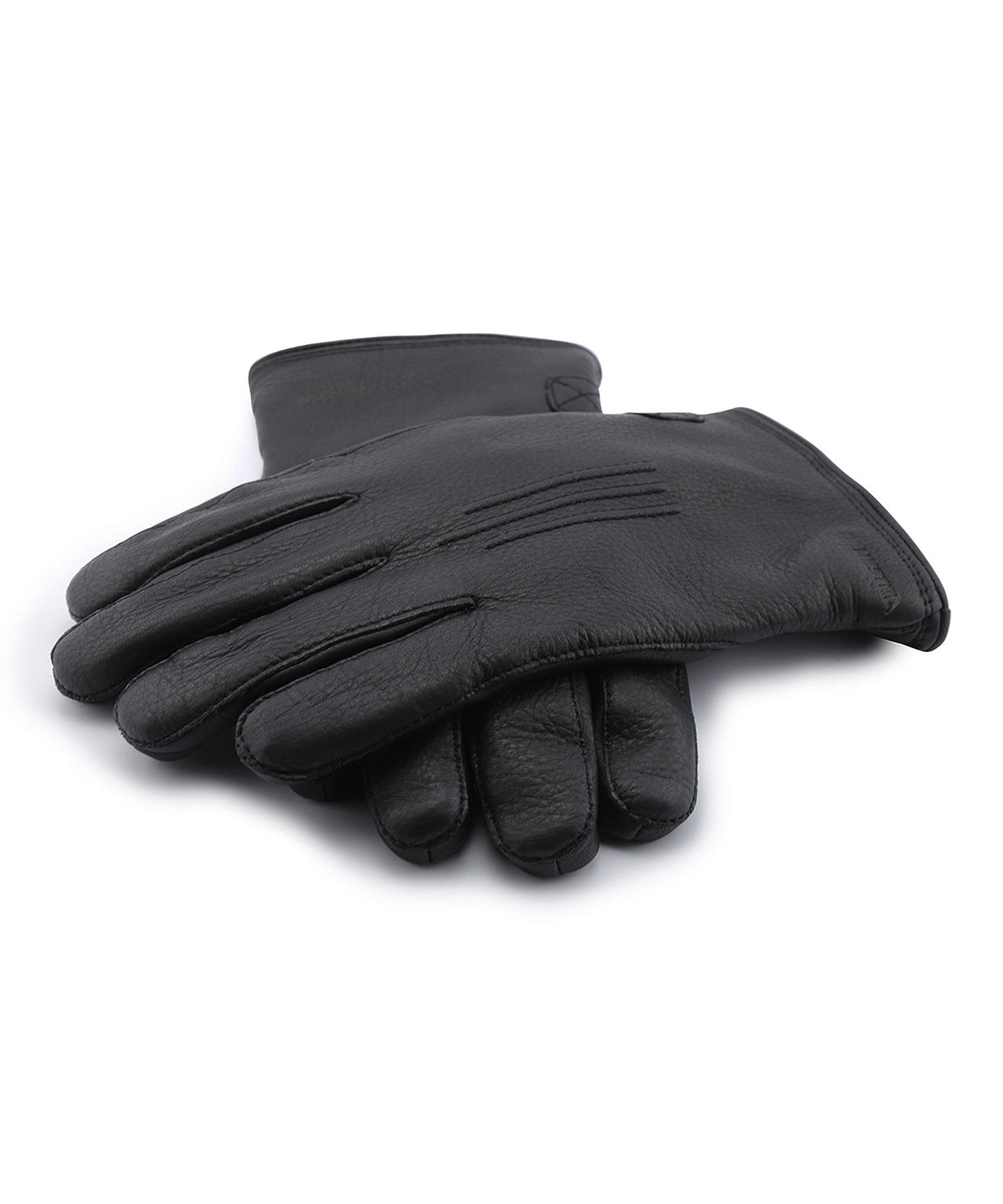 Een prachtig stevige winterhandschoen met een warme voering van lamsleer. Gemaakt van hertenleer: sterk, maar zacht, en uitstekend in het vasthouden van warmte. Het klassieke herenontwerp is afgewerkt met decoratieve stiksels op de handrug en een leren band met drukknoop bij de pols.