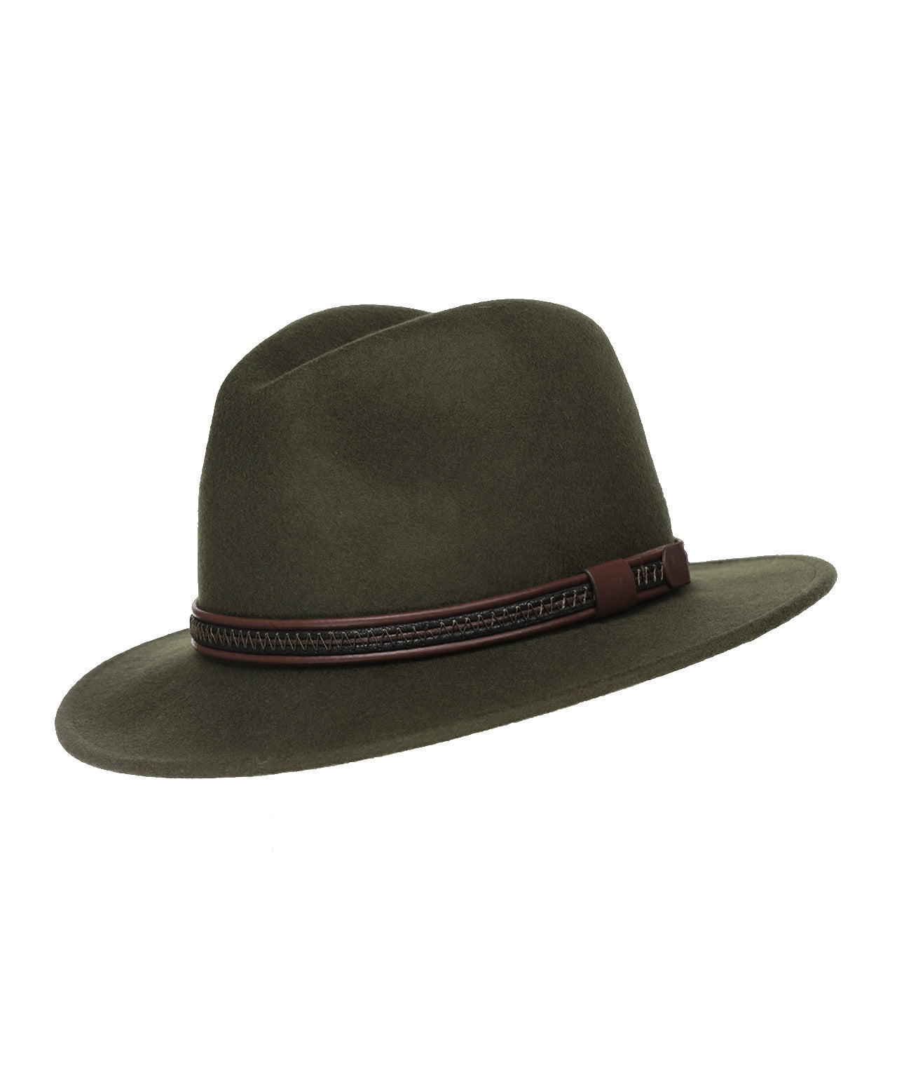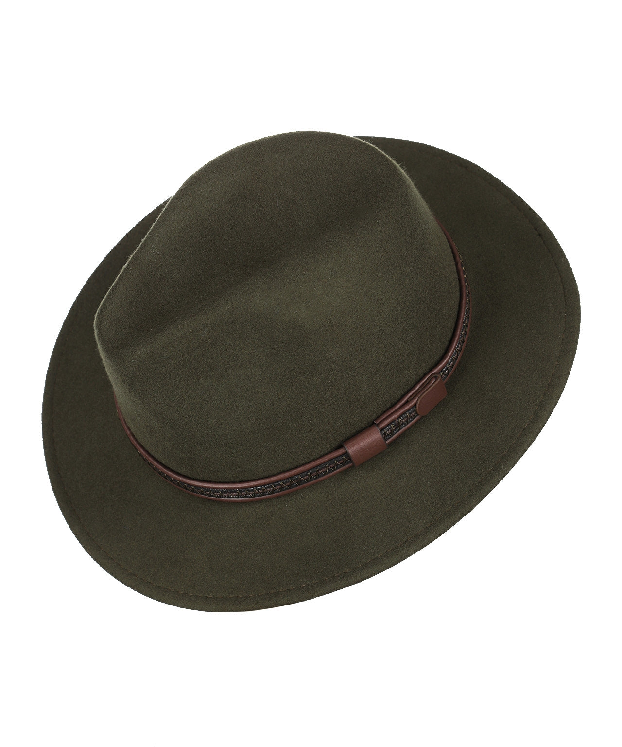 Sportieve wolvilten hoed met een 6 cm brede rand. De Ashford heeft een bewerkt lederen riem om de hoed zitten.