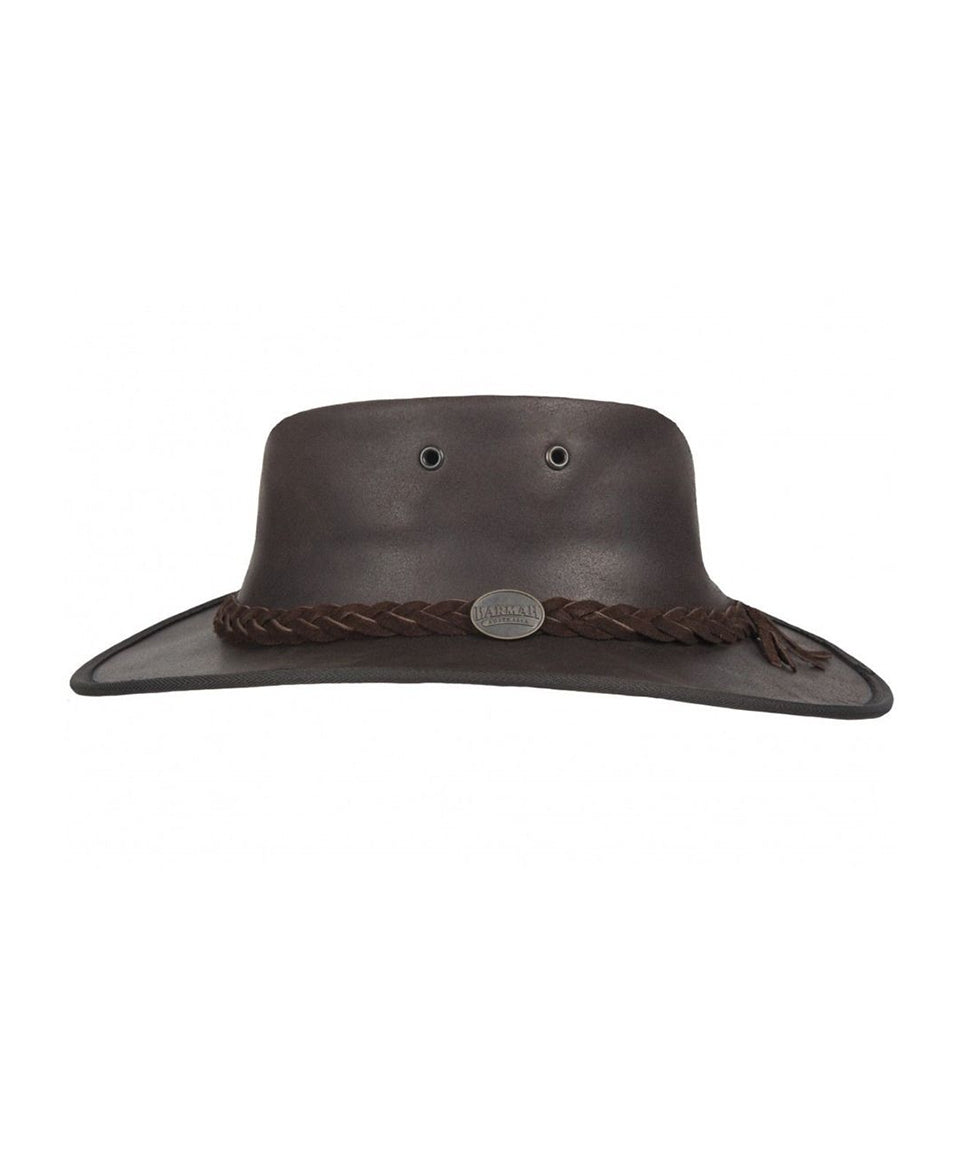 Lederen Australische hoed van het merk "Barmah hats". Deze hoed kunt u oprollen en beschermt u tegen de zon en de regen. Deze hoed is gemaakt van 100% rundleer.