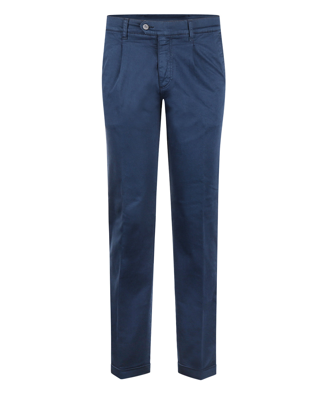 Katoenen pantalon met bandplooi en een omslag. In het katoen zit 3% elastan mee geweven zodat deze pantalon comfortabel draagt. Deze broeken worden speciaal voor The English Hatter gemaakt in Europa. De breedte van de pijp bij de omslag is 19 cm (plat gemeten).