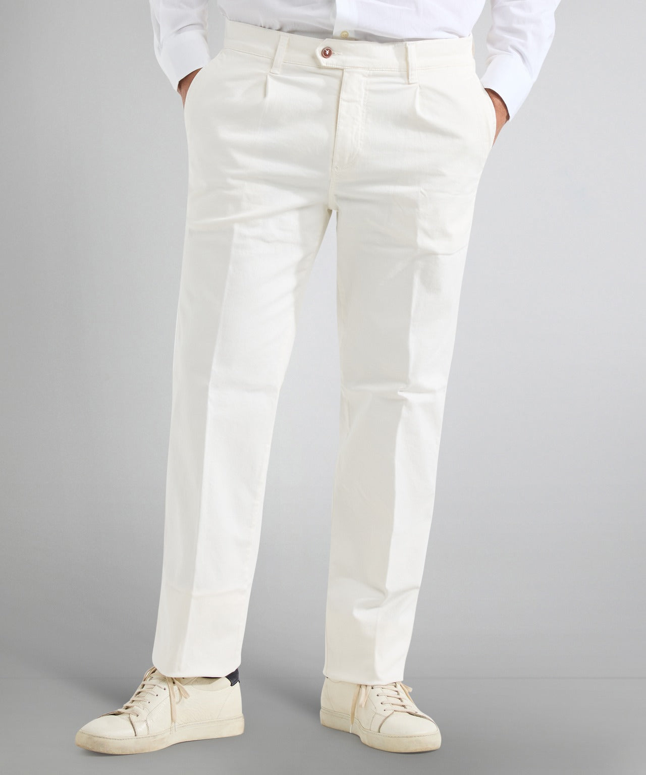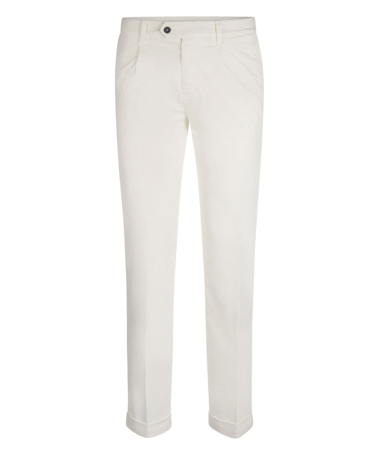 Katoenen pantalon met bandplooi en een omslag. In het katoen zit 3% elastan mee geweven zodat deze pantalon comfortabel draagt. Deze broeken worden speciaal voor The English Hatter gemaakt in Europa. De breedte van de pijp bij de omslag is 19 cm (plat gemeten).