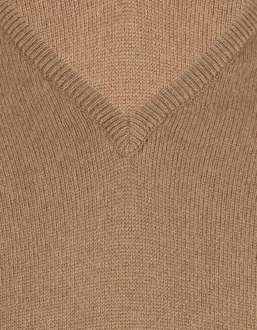 Bijzondere v-hals pullover van William Lockie uit Schotland. William Lockie is wereldberoemd om het gebruik van de mooiste lamswol maar deze keer hebben ze gekozen voor het zeer exclusieve "Camelhair".  Zoals de naam al vermoedt komt dit garen van de haren van een kameel af. Dit voelt zeer zacht aan, u kunt dit vergelijken met cashmere. Dit garen is ongeverfd en is dus de natuurlijke kleur van de kameel.