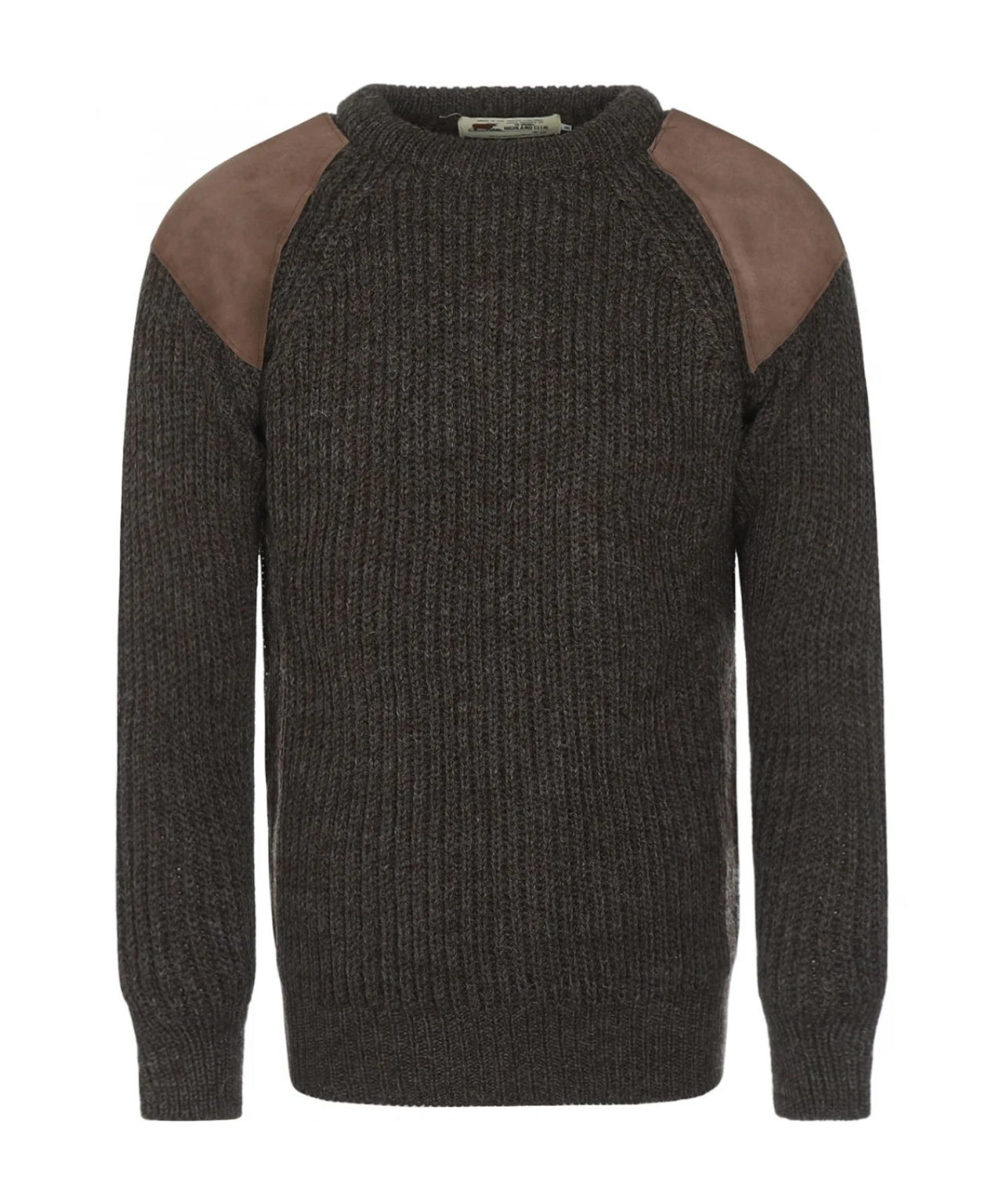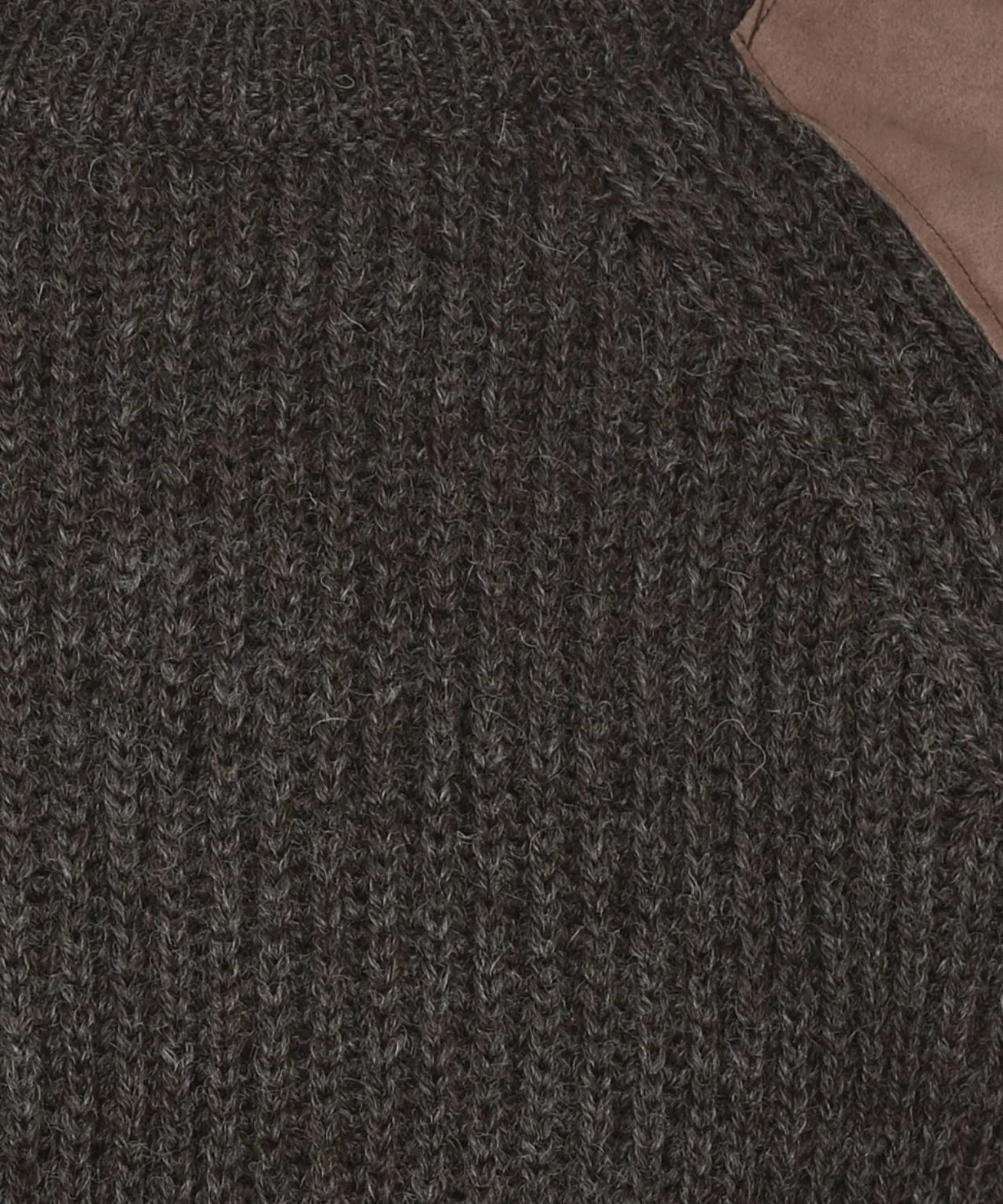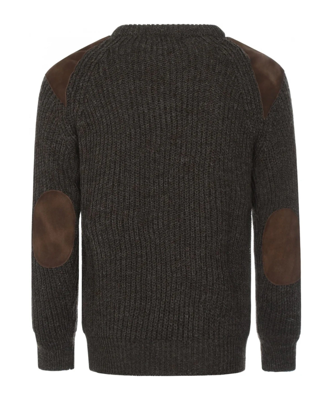 Geweldige 100% wollen pullover met suede stukken op de mouw en schouder. Deze Highland Club pullover is gemaakt met ongeverfde wol, deze wol komt rechtstreeks van het schaap en is dus de natuurlijke kleur. De pullover is tradioneel gemaakt op een "hand frame". Omdat dit een kleine fabrikant is kan de kleur van de leren stukken een beetje variëren. De ene zending zijn ze wat donkerder bruin en soms wat lichter bruin.