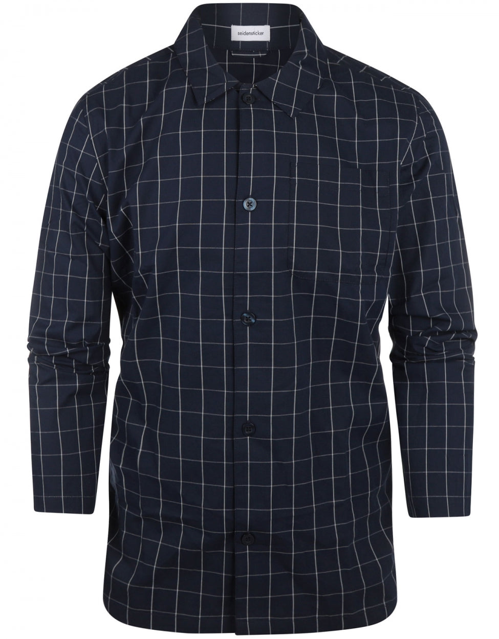 Complete katoenen pyjama set van het merk Seidensticker, vervaardigd van 100% hoogwaardig poplin katoen. Deze comfortabele set bestaat uit een volledig doorgeknoopt jasje met een borstzakje en een bijpassende broek met een elastische tailleband en verstelbaar koord. Dankzij de normale pasvorm en ademende stof biedt deze pyjama ultiem draagcomfort voor een ontspannen nachtrust.