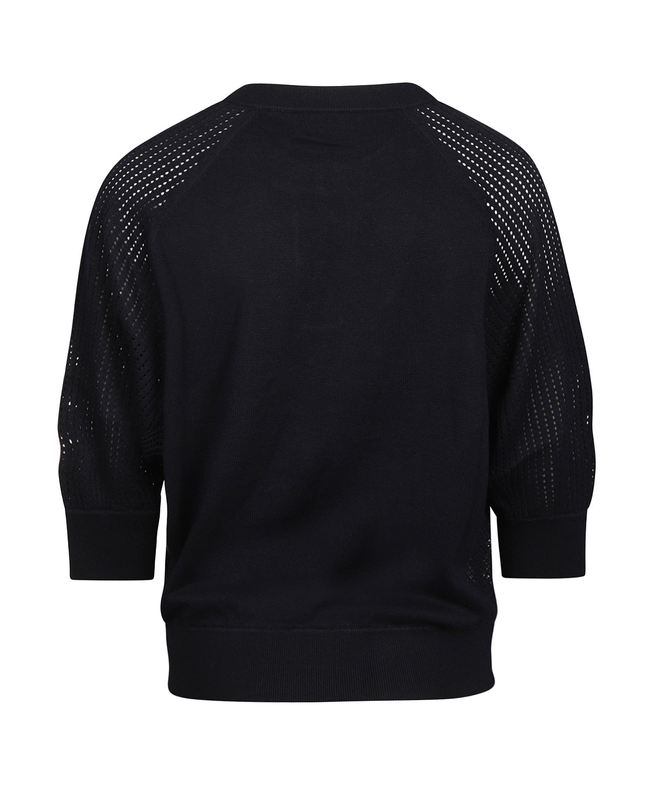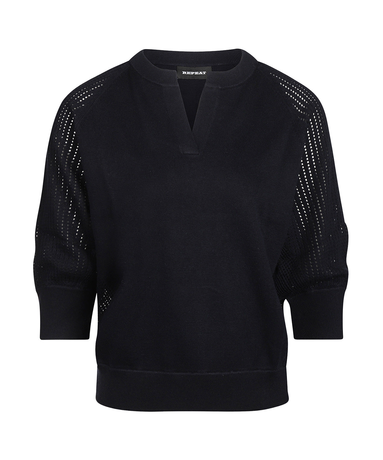 Dit Repeat Dames V-Hals truitje heeft een elegante V-hals en 3/4 mouwen, ideaal voor een luchtige, maar verfijnde look. De geribde manchetten geven het een subtiele structuur, terwijl het speciale ontwerp met luchtige gaatjes in de mouwen voor een unieke en speelse uitstraling zorgt.