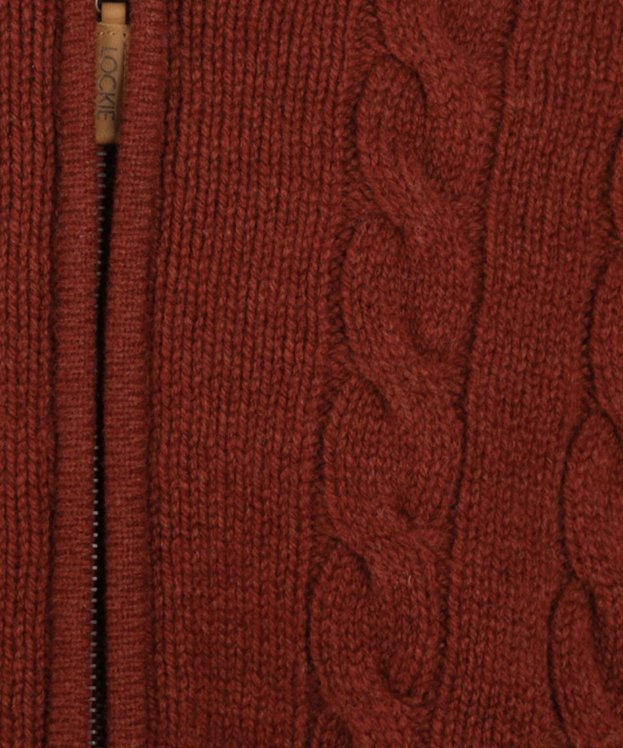Lamswollen vest van de Schotse breier William Lockie, u kunt het vest hoog sluiten middels de rits. Het vest heeft een gebreid kabel patroon.