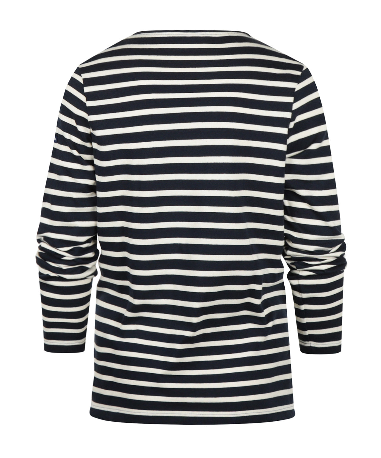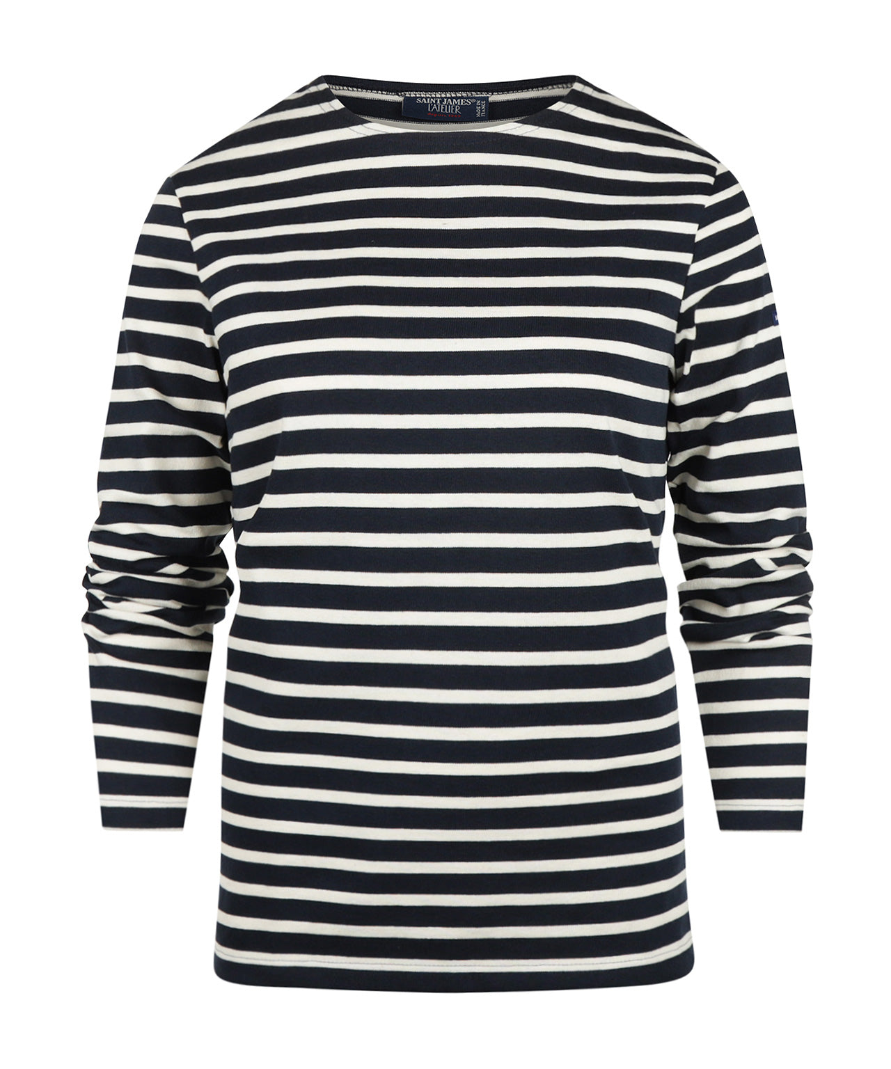 De Saint James Meridame II is een tijdloos Bretons dames-trui met lange mouwen, gemaakt van authentiek gekaard katoen. Dit model biedt een eigentijdse interpretatie van de klassieke marinestreep, met een rechte snit en een iets wijder uitgesneden halslijn voor extra draagcomfort. De zware jersey zorgt voor een stevige, maar ademende pasvorm, perfect voor dagelijks gebruik. Met een lengte van 62,5 cm is dit veelzijdige shirt eenvoudig te combineren voor elke gelegenheid. De Meridame is de vrouwelijke variant van de Méridien Moderne. De maattabel is de Franse maattabel. Voorbeeld: maat 38 Frans = 36 NL/E/D = XS Int.