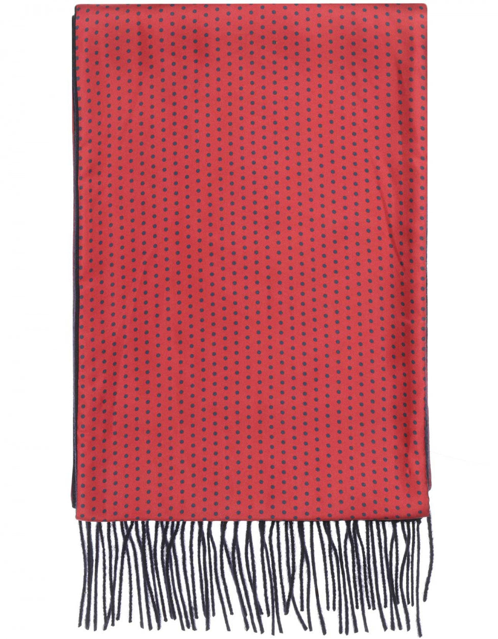 Zijden sjaal met een lamswollen tegenvoering bedrukt met klassieke stippen. De sjaal is 28 cm breed en 150 cm lang. 100% zijde, 100% lamswol.
