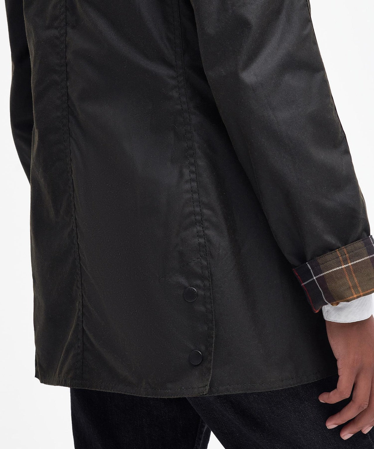 Een waar icoon van het Britse platteland, de Barbour Classic Beadnell Wax Jacket is gebaseerd op de legendarische Bedale, bijgewerkt met een nieuwe snit en naden om een ​​vrouwelijker silhouet te creëren met een tijdloos Barbour-gevoel. Gemaakt met een buitenkant van Sylkoil-gewaxt katoen en een katoenen voering aan de body met onze kenmerkende tartan voor de typische Barbour-look. Ideaal om het hele jaar door te dragen en kan afhankelijk van het seizoen als laagje of solo worden gedragen. Het beschikt over een traditionele corduroy kraag, stormgulpsluiting in de nek en een slijtvaste ritssluiting met de toevoeging van een stormflap met drukknoopsluiting om de kou buiten te houden. Klassieke details zijn onder meer handwarmerzakken gevoerd met moleskin en onze opvallende afgeronde lagere plooizakken met geborduurd merklogo. Gesneden voor een normale pasvorm en een vrouwelijk silhouet.  (Universele maat) = (Britse maat)/(Europese Maat) M=12/38  L=14/40  XL=16/42  XXL=18/44