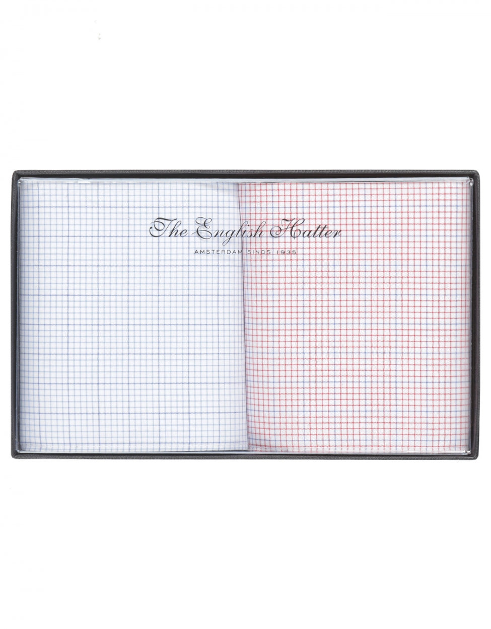 Zakdoeken in een doosje, speciaal gemaakt voor The English Hatter. U krijgt 2 100% katoenen zakdoeken in een doosje. De zakdoeken zijn 45 cm x 45 cm.