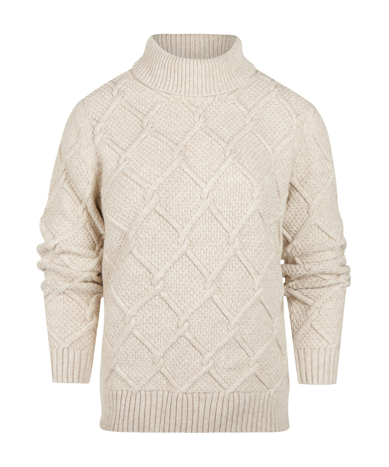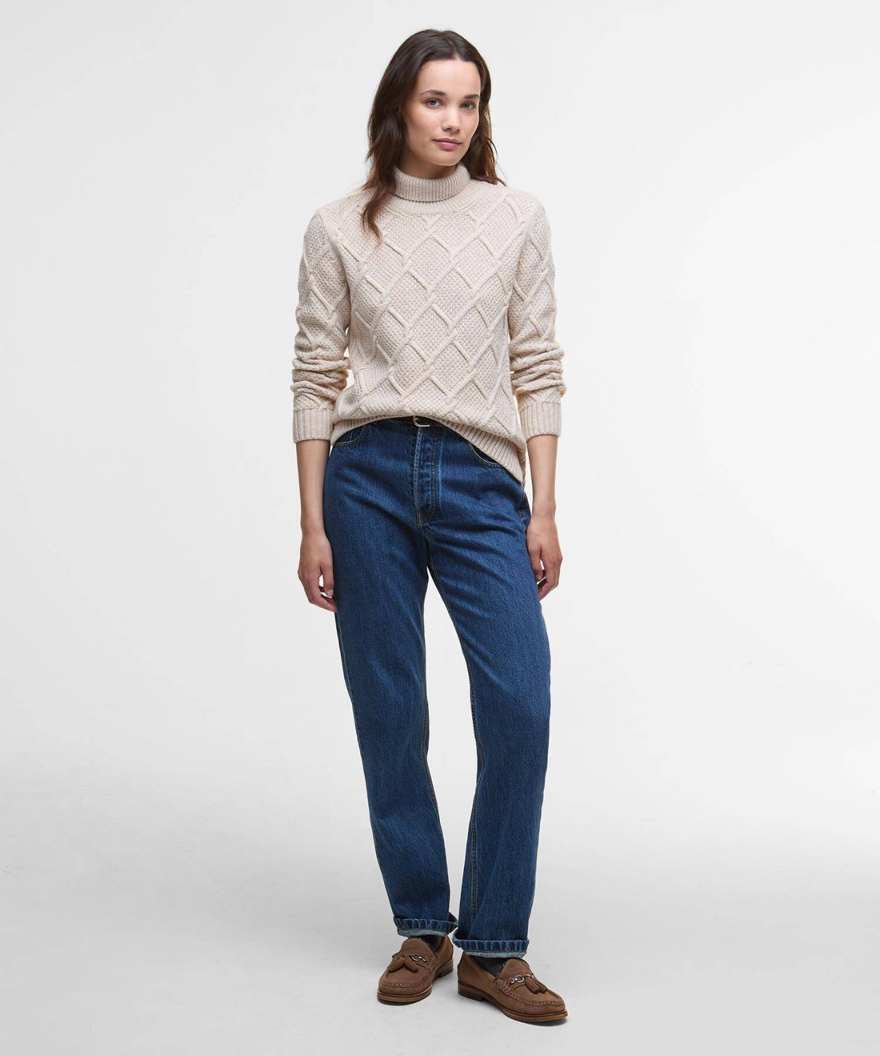 Women's turtleneck sweater made of 55% wool and 45% cotton with a stand-up collar and long sleeves, ideal for casual looks. The argyle-inspired cable knit gives the sweater a stylish look. Features a Barbour ID label at the back of the neck. Back length: 64 cm. Hand wash at 30°C.