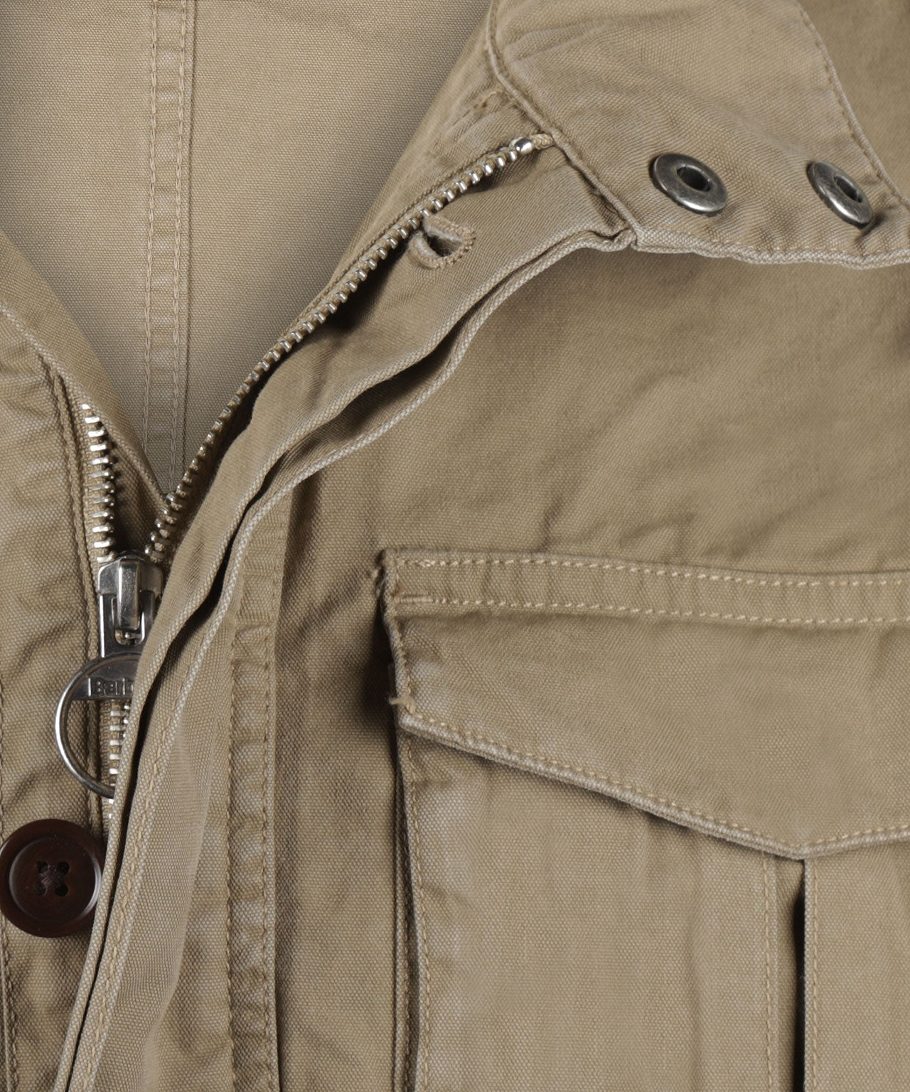 Lightweight cotton mix jacket from Barbour. The Belsfield has 4 pockets on the front and 1 inside pocket. The two large flap pockets on the front also serve as a slit pocket. The fit is normal. The Belsfield has a traille cord and has a zip that is hidden behind a button closure. The Belsfield is not waterproof.