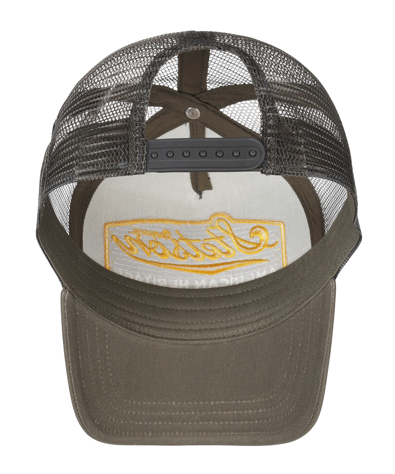 The well-known trucker cap with mesh and adjustable closure. Also called baseball cap.