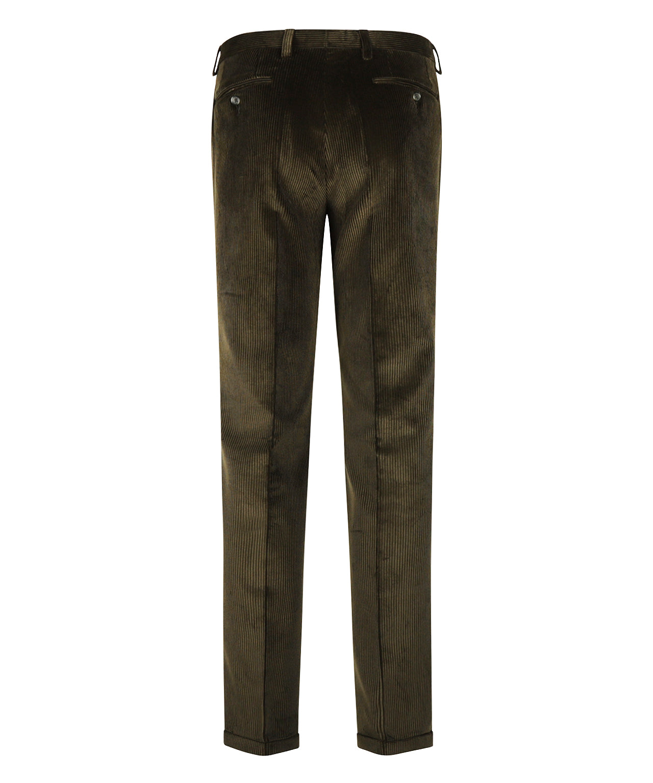 Full corduroy trousers made from Brisbane and Moss corduroy. The trousers feature a pleat and a turn-up at the leg. The pipe opening is classically wide, measuring no less than 22 cm when measured flat.