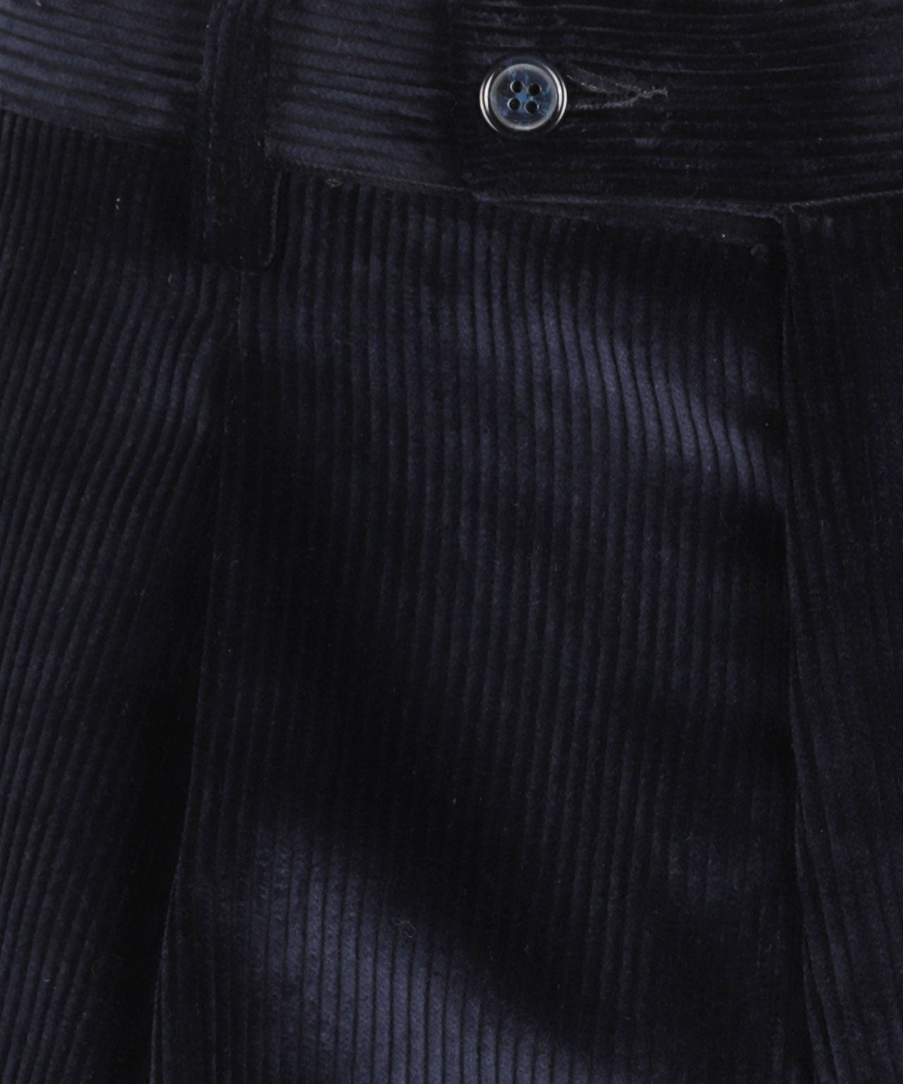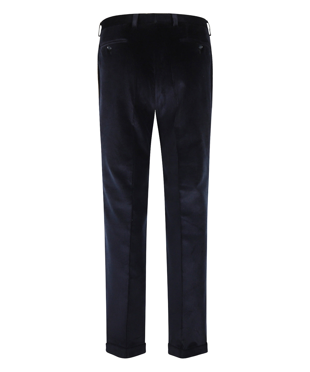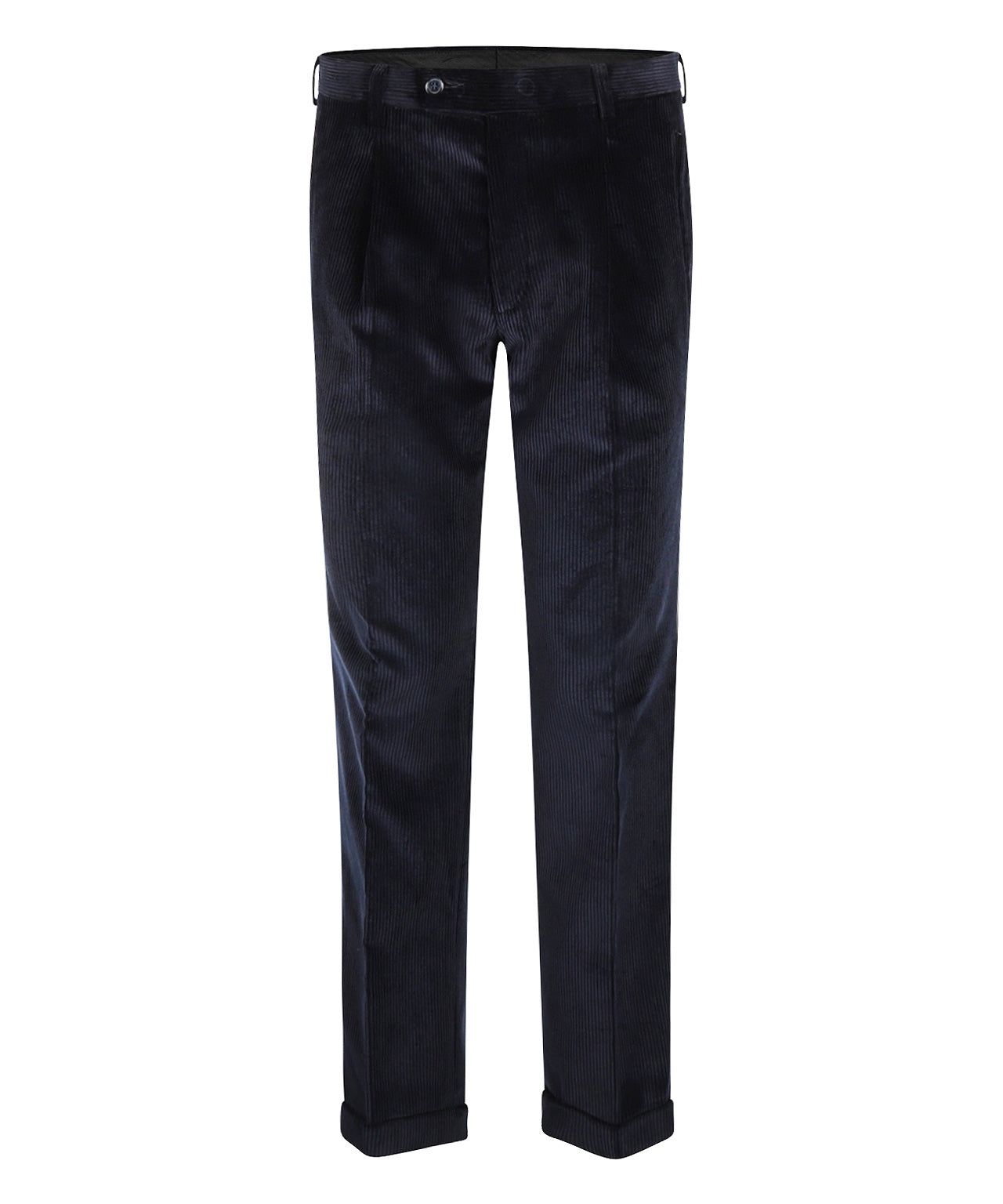 Full corduroy trousers made from Brisbane and Moss corduroy. The trousers feature a pleat and a turn-up at the leg. The pipe opening is classically wide, measuring no less than 22 cm when measured flat.