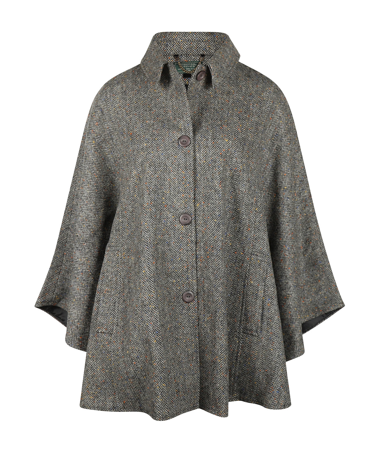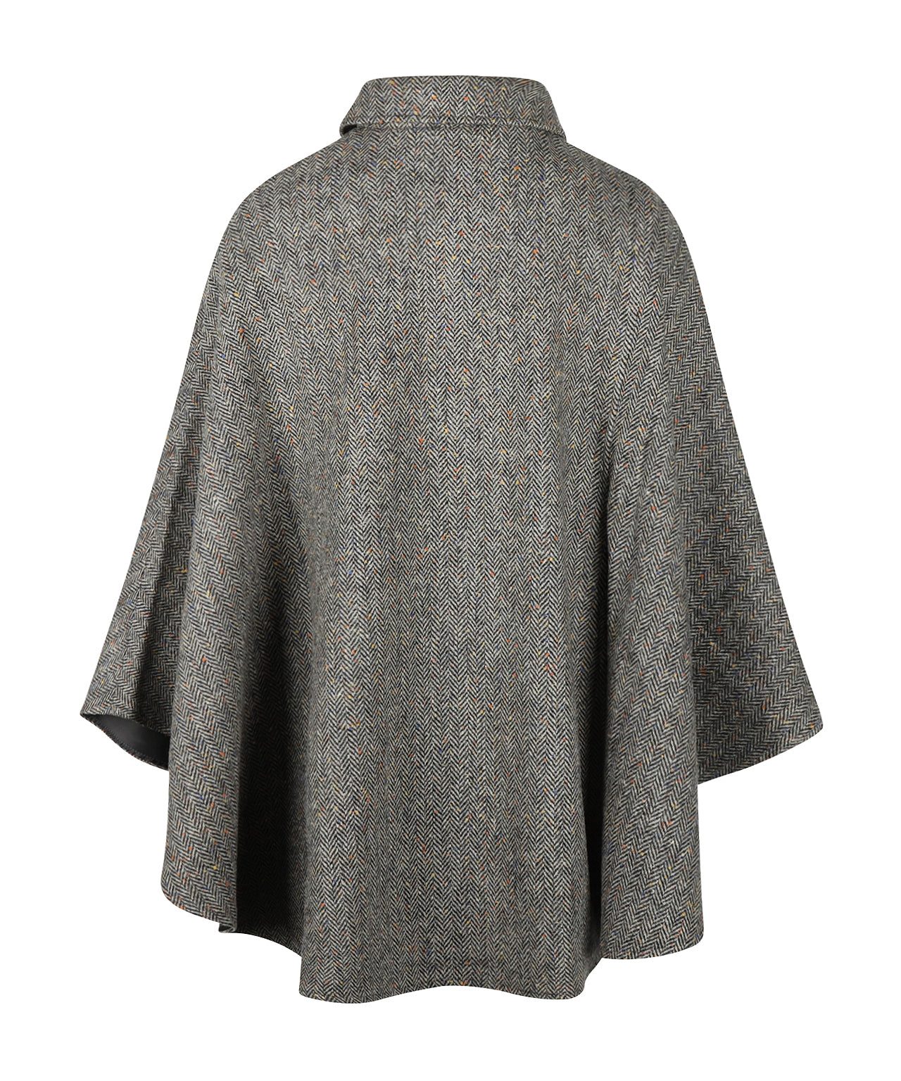 Relaxed fit women's cape made of 100% wool. Features a collar, welt pockets, and a top-to-bottom button closure. One size fits most, suitable for autumn. Dry clean and iron once.