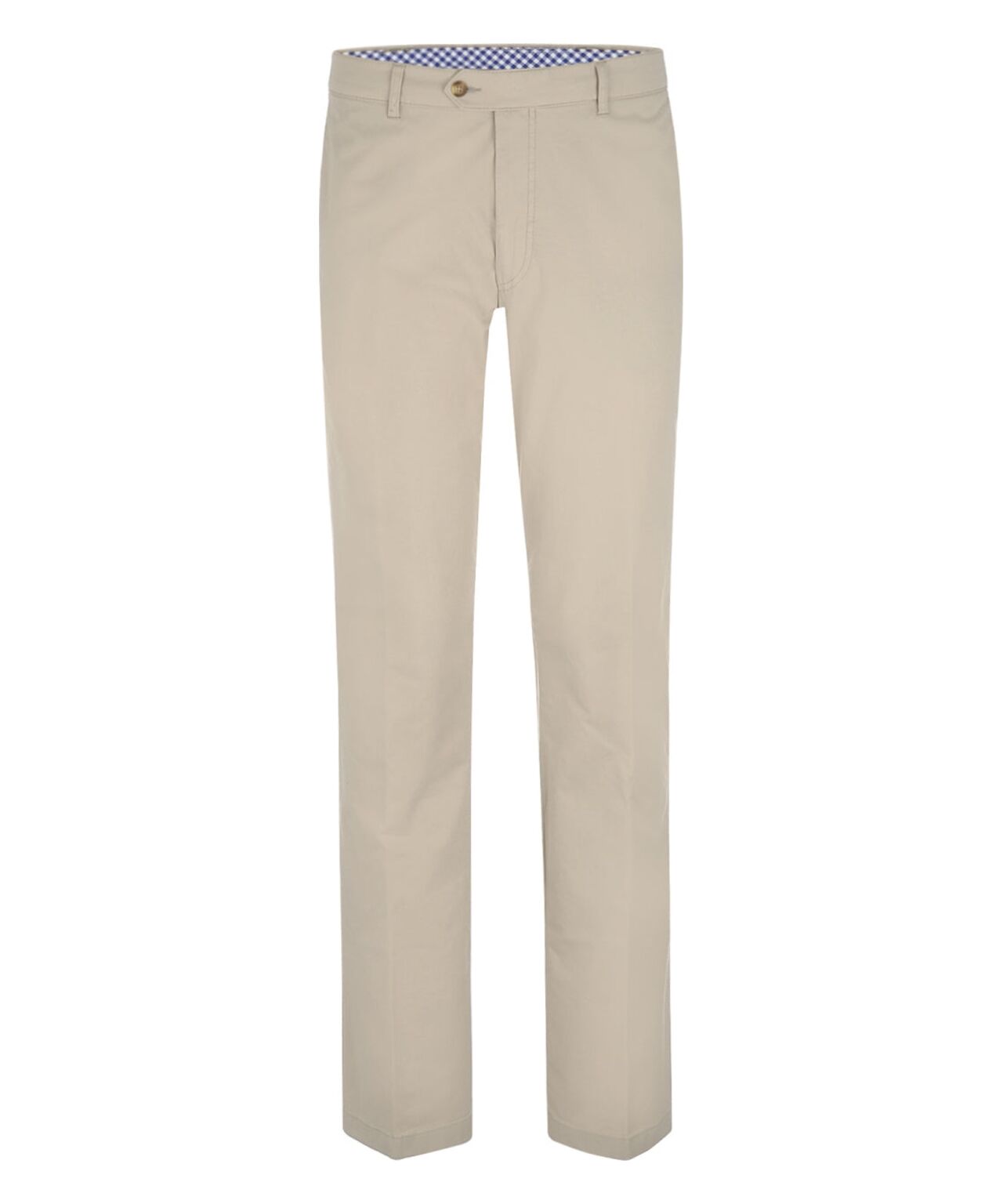 Thin cotton trousers in a chino design, ideal for warmer days. These chinos are specially made for The English Hatter. The trousers have 2 spacious pockets at the front and 2 closable pockets at the back. As a chino should be, these trousers are made in a flat front without a turn-up at the bottom. The cotton fabric has 2% elastane woven in so that the trousers are comfortable. We recommend washing the trousers at a maximum of 40 degrees or taking them to the dry cleaners.