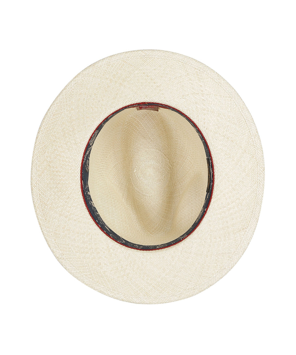 Panama hat with a summery printed fabric stretched around the crown. This panama has a sloping brim so that you remain well protected from the sun. The brim is approximately 7 cm wide.
