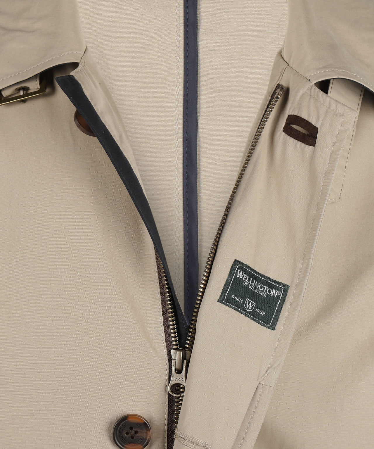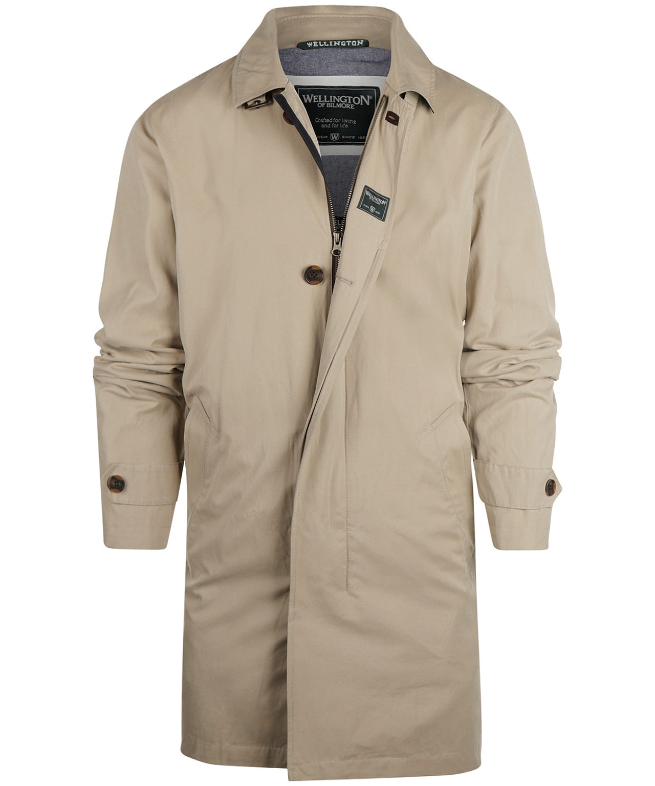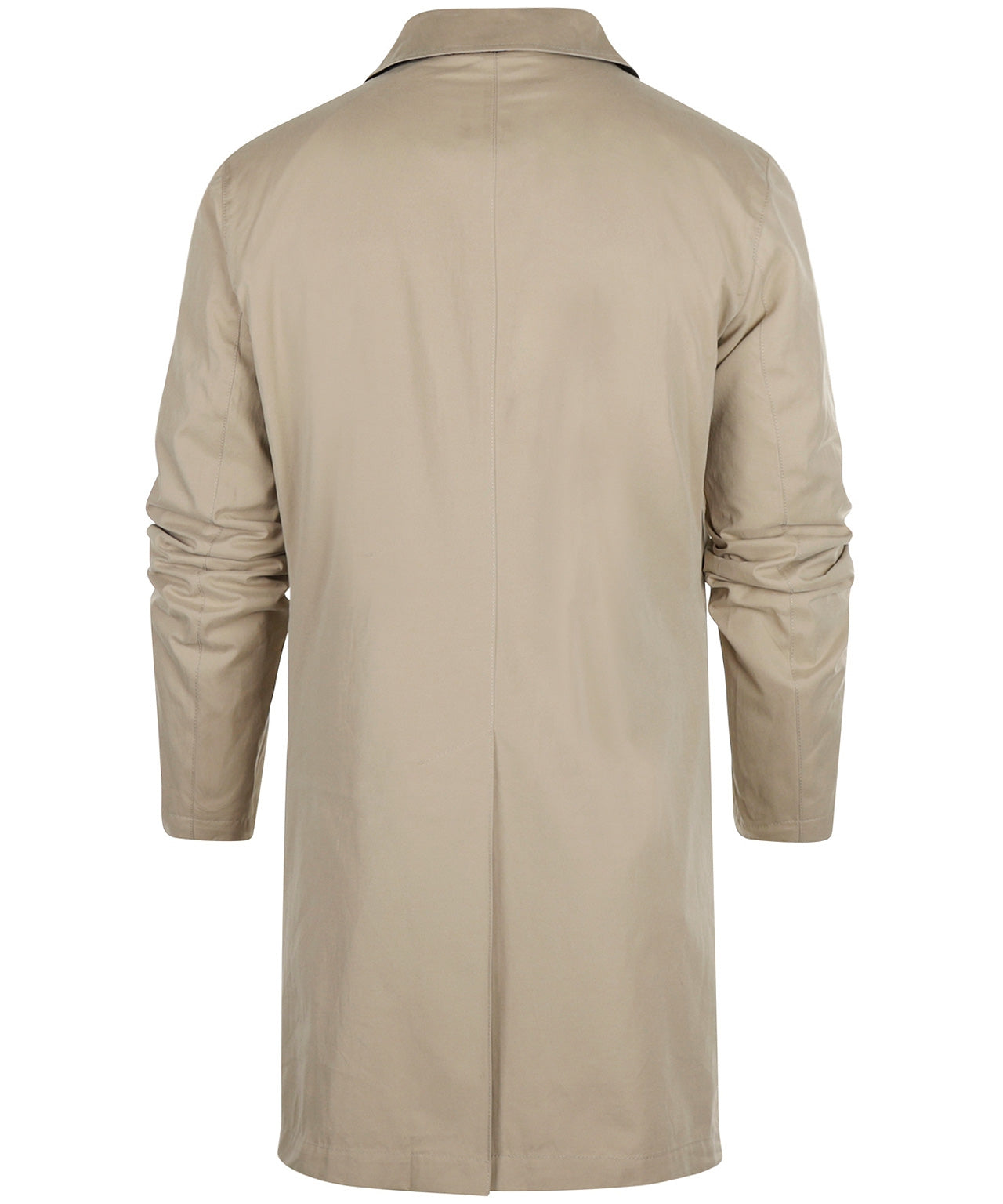 Long coat, just above the knee, with a zip covered by a button placket. The coat has a sporty belt at the collar as a wind closure.