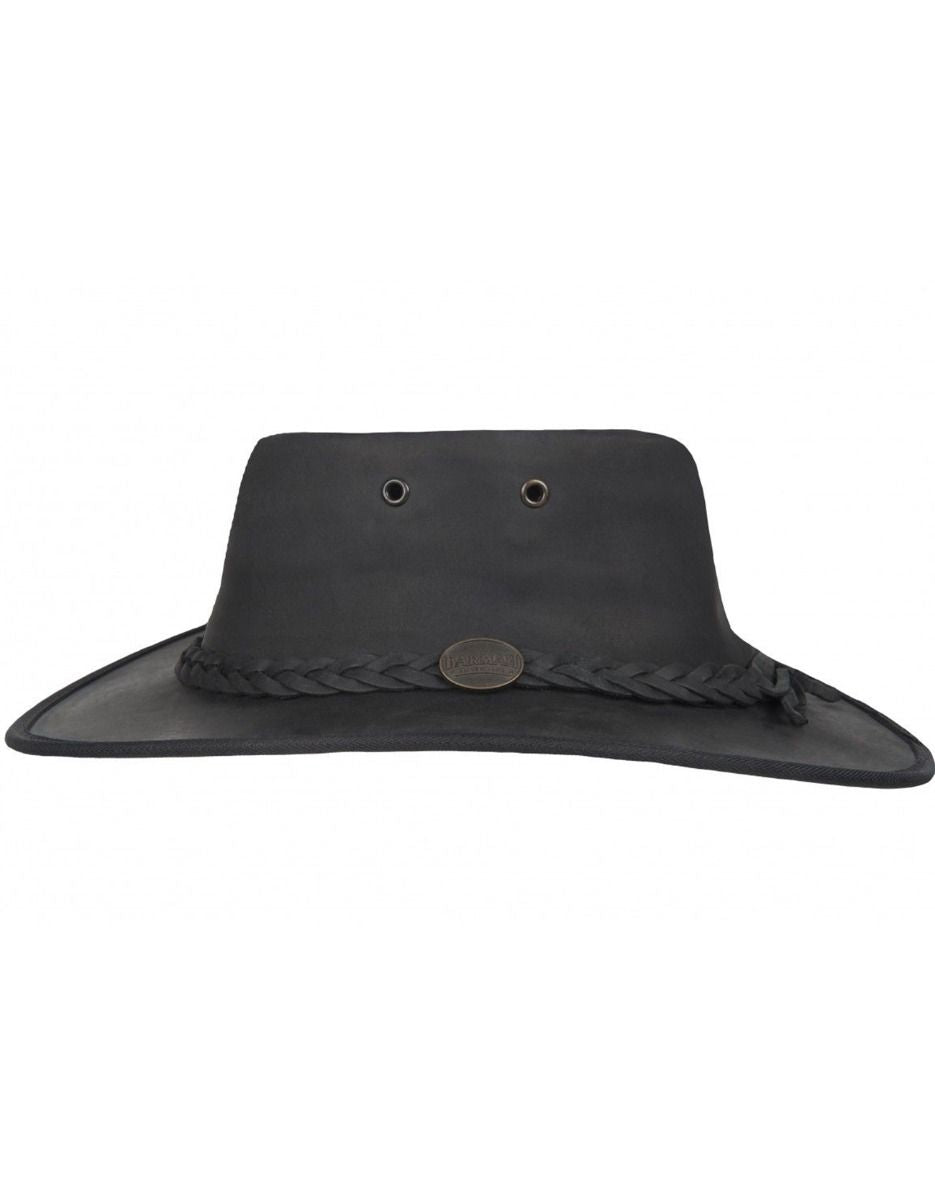 Leather Australian hat from the brand "Barmah hats". This hat can be rolled up and protects you from the sun and rain. This hat is made of 100% cow leather.
