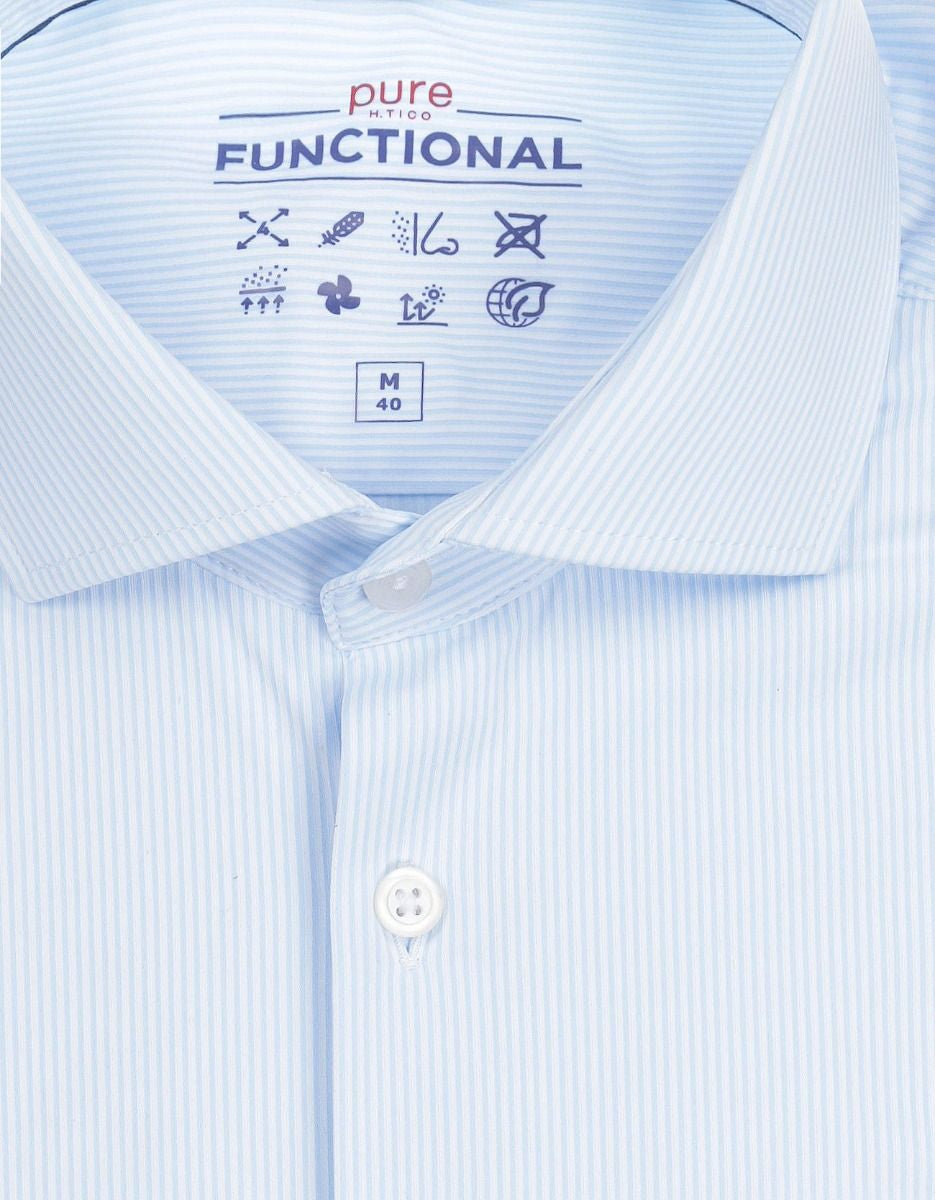 Pure Functional Shirt, this shirt is different from all our other shirts. Pure Functional shirt is made of 87% polyamide and 13% elastane. This high-tech fabric is developed and made in Northern Italy and has its origins in outdoor sports. Thanks to this high-tech fabric, this shirt breathes very well, feels cool (even when it is very warm) and is non-iron. The shirt masks unwanted odors and has a UV 50+ protection. Due to the elastane, this shirt has a "four-way" stretch and the body size also changes per collar size. In short, a perfect fit! (see the dropdown menu "Description" for the size chart)
