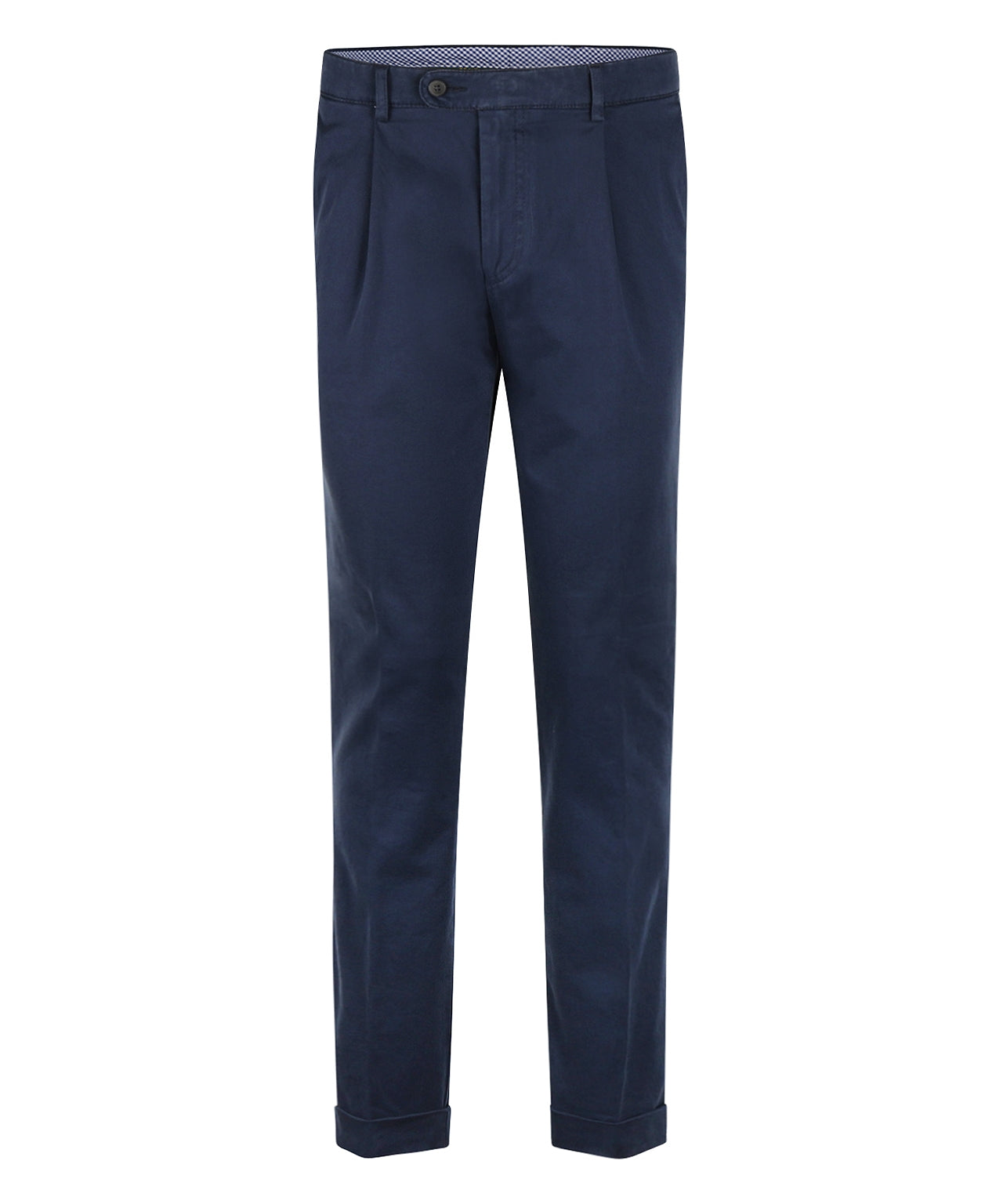 Cotton pleated trousers with turn-up, the trousers contain 2% elastane woven in for a comfortable fit. The "Blackpool" has a somewhat fuller cotton fabric, making the "Blackpool" extremely suitable for autumn and winter. The width of the pipe at the fold is 20 cm (measured flat).