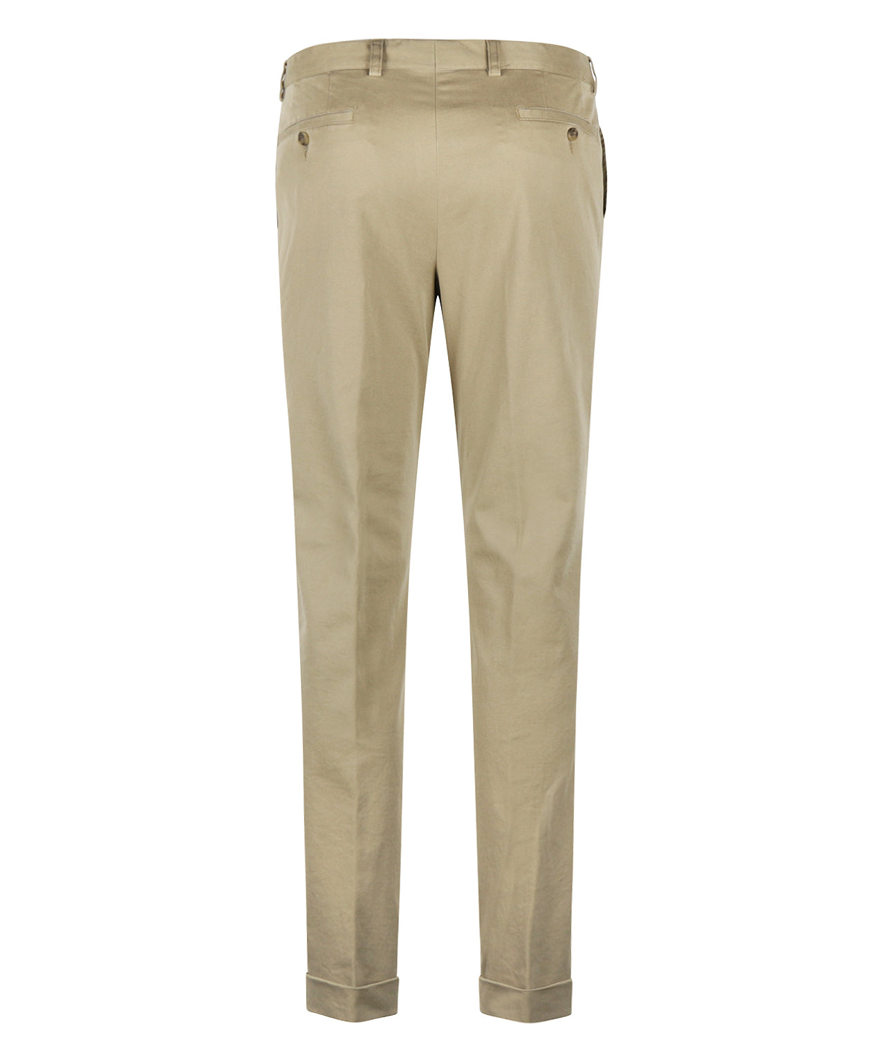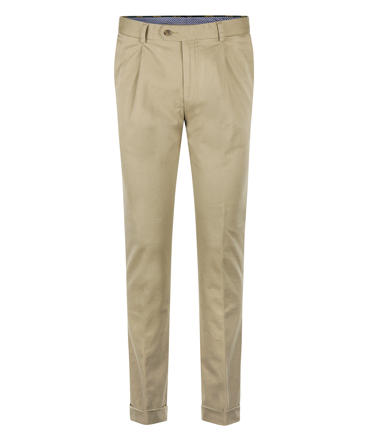 Cotton pleated trousers with turn-up, the trousers contain 2% elastane woven in for a comfortable fit. The "Blackpool" has a somewhat fuller cotton fabric, making the "Blackpool" extremely suitable for autumn and winter. The width of the pipe at the fold is 20 cm (measured flat).