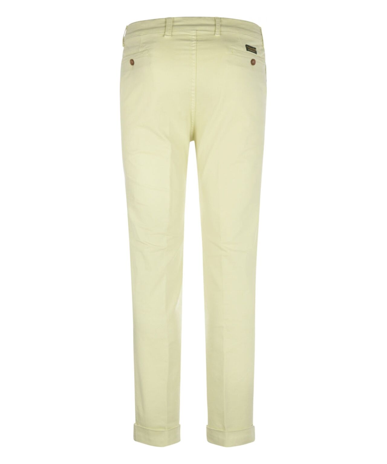 Cotton trousers with pleat and a turn-up. The cotton contains 3% elastane woven into it, making these trousers comfortable to wear. These trousers are specially made for The English Hatter in Europe. The width of the leg at the cuff is 19 cm (measured flat).