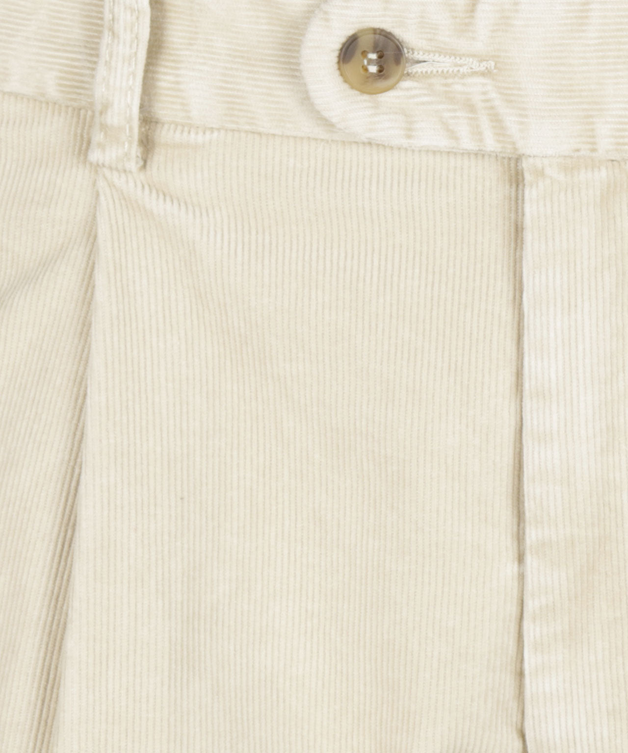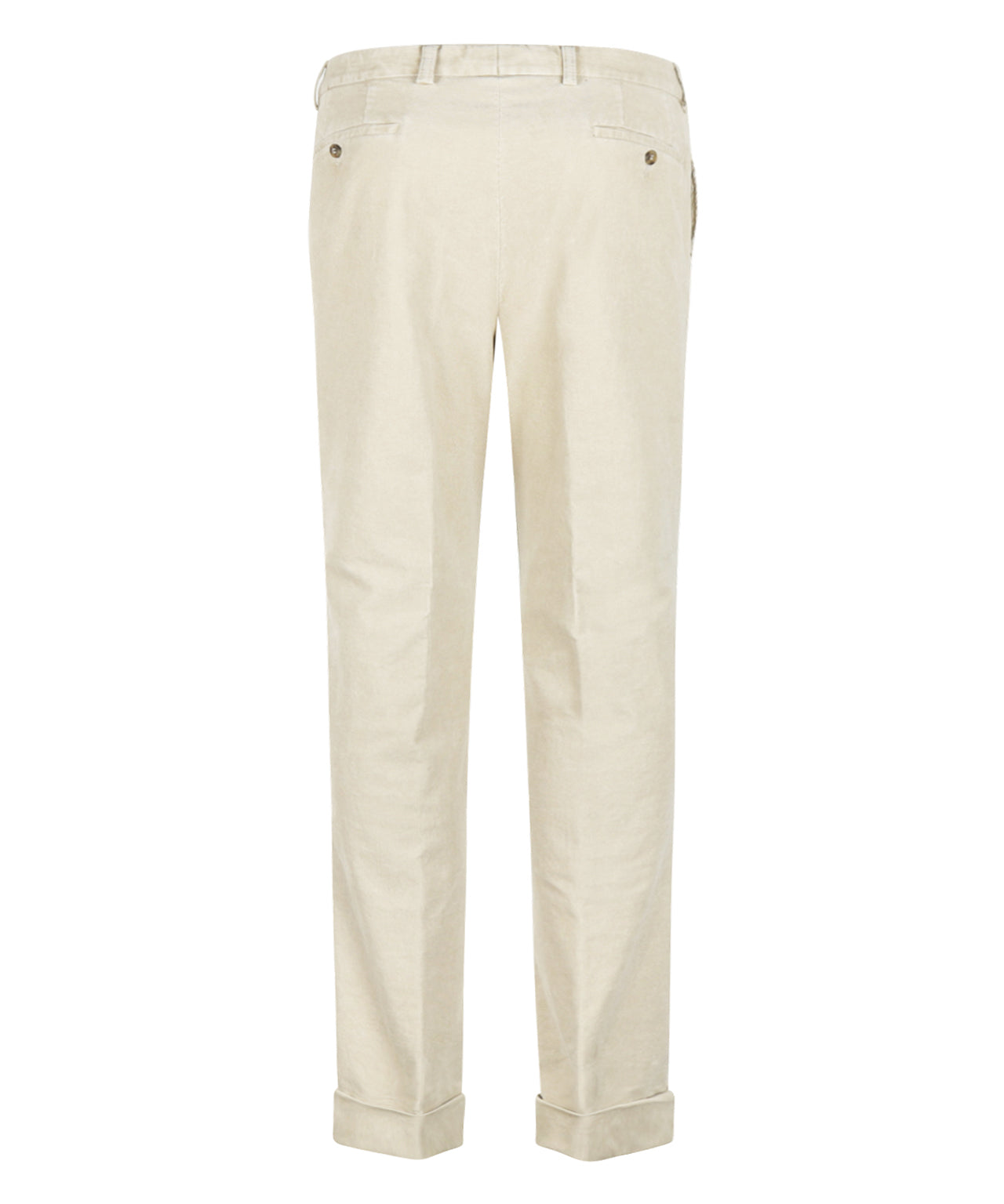 Classic corduroy slim rib trousers with pleat and turn-up. The trousers have deep pockets and loops around the waist for a belt. The pockets on the back have buttons. The trousers are made of 97% cotton with 3% elastane for a comfortable fit . The width of the leg at the cuff is 19 cm (measured flat).