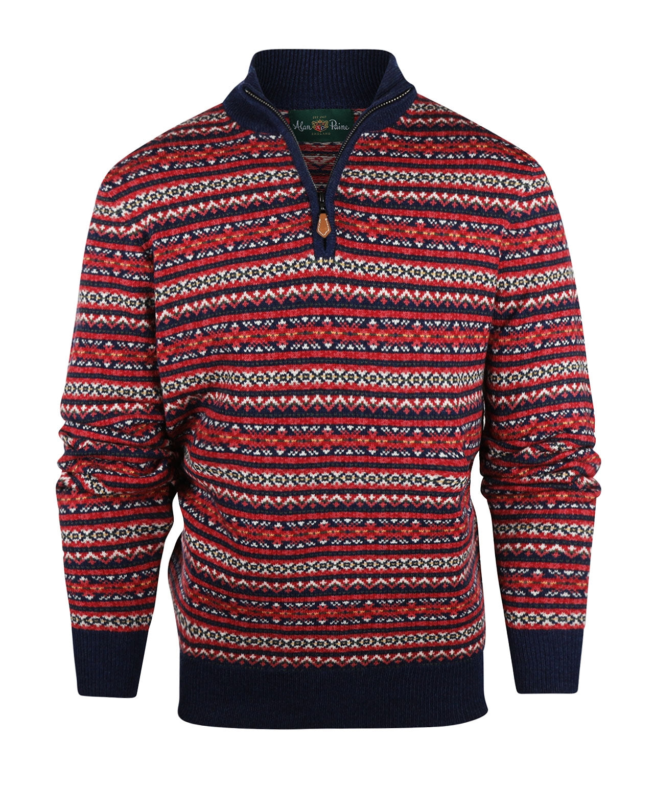 Beautiful polo pullover by English knitter Alan Paine, made in the typical Fair Isle pattern. This sweater is made of lambswool. This lambswool is supplied by Hinchliffe.