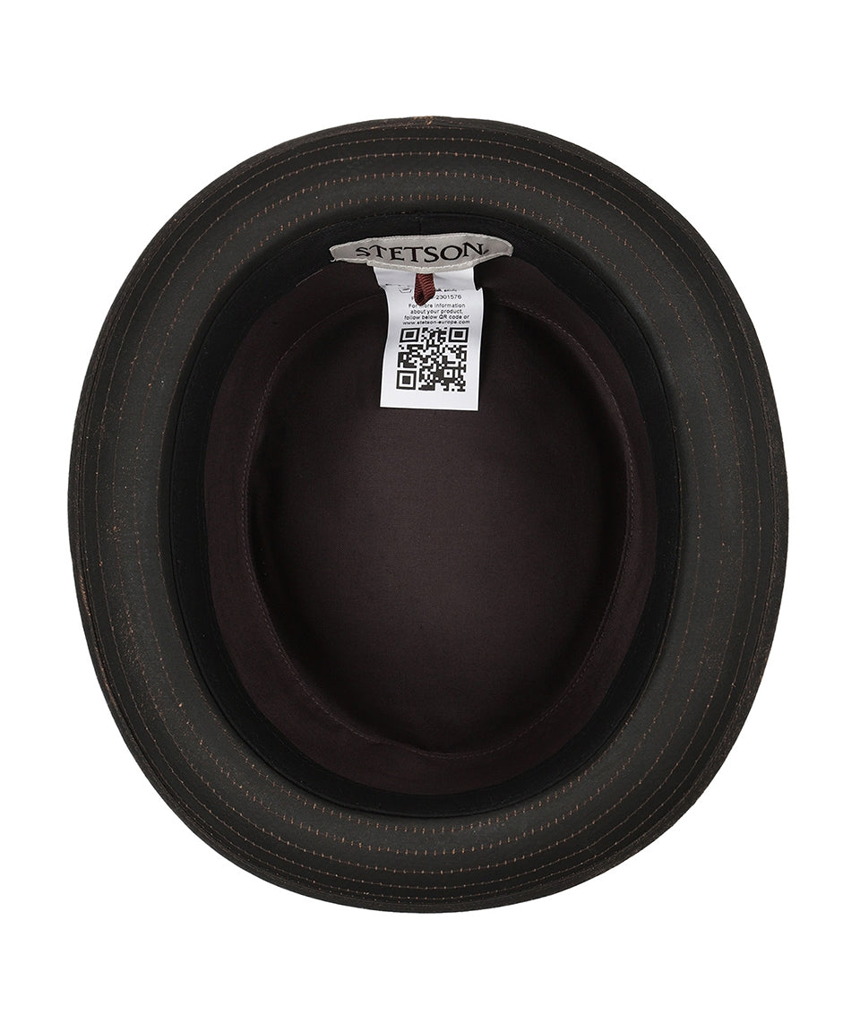 Porkpie hat by Stetson, made of cotton with a polyester coating. This gives this porkpie a weathered look.
