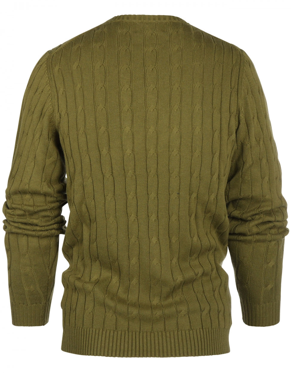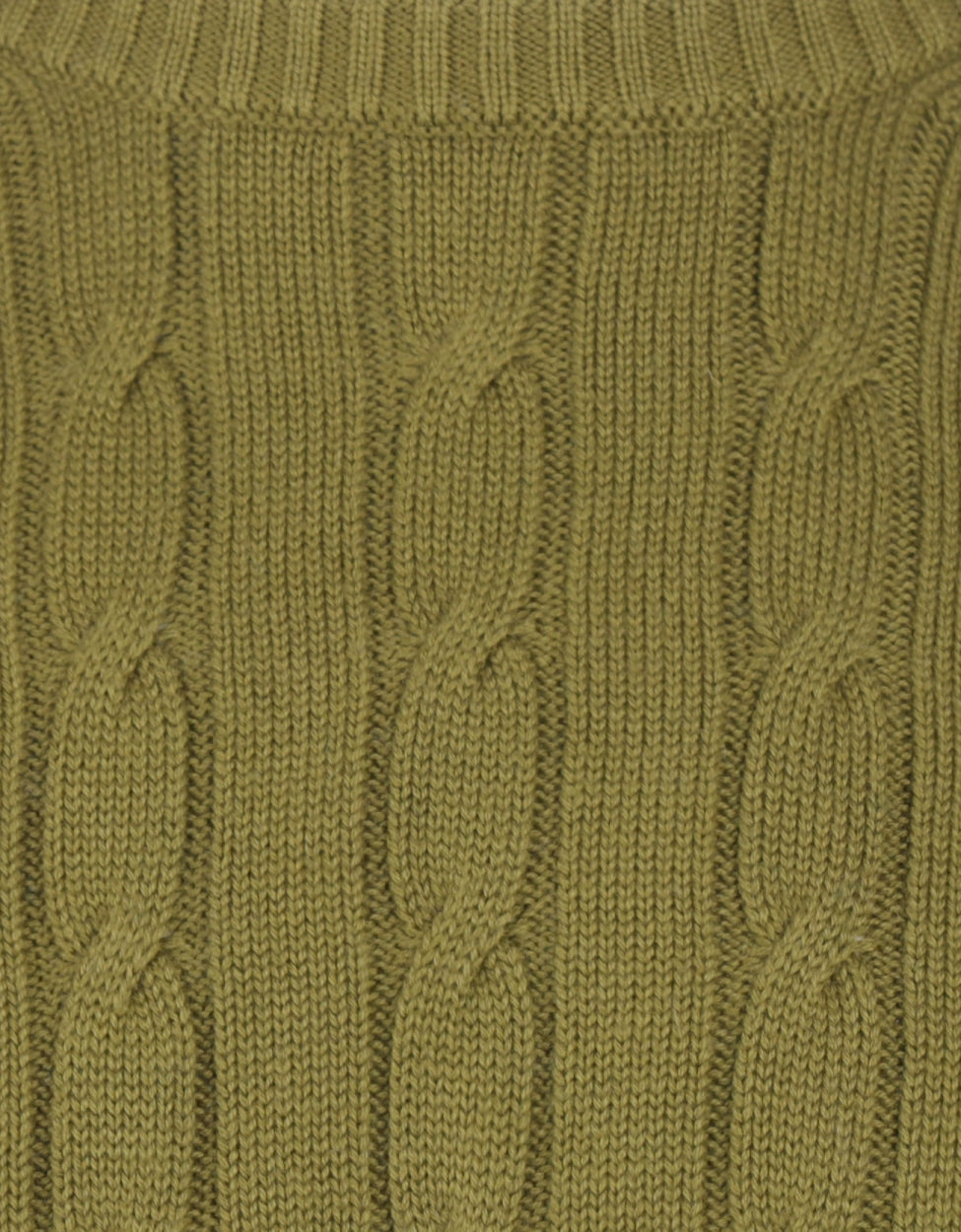 Cable knit sweater with a round neck made of 92% cotton and 8% cashmere.