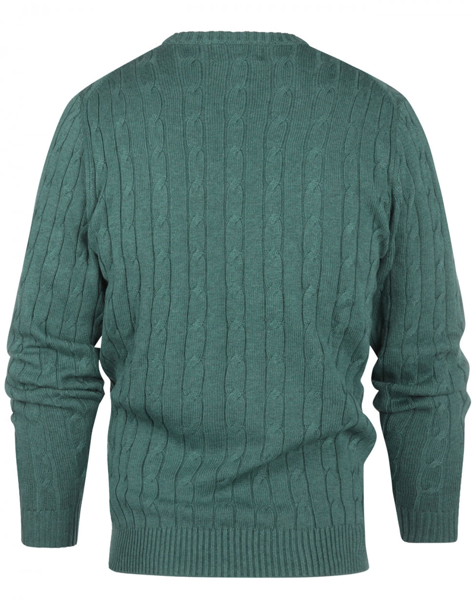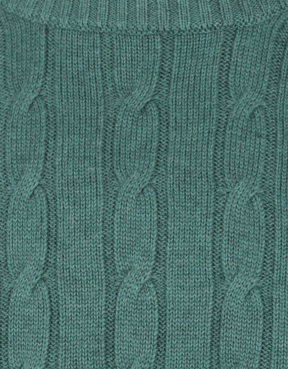 Cable knit sweater with a round neck made of 92% cotton and 8% cashmere.