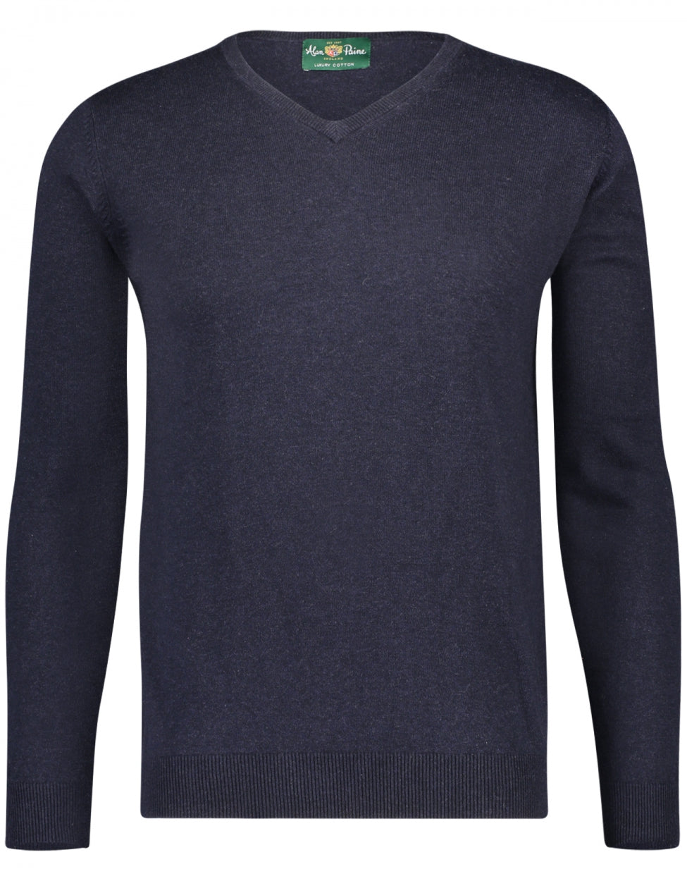 A plain knitted v-neck sweater, made from a luxurious blend of high-quality cotton and cashmere. The sweater has a cuff on the sleeves and bottom and has a regular fit. Made from 92% cotton 8% cashmere.