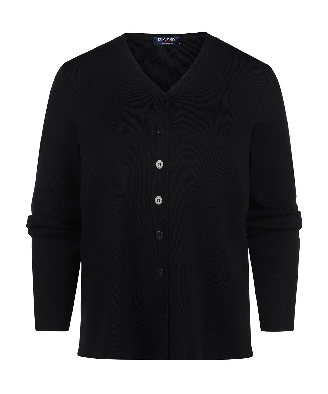 The Saint James Brevands women's cardigan is an elegant and versatile piece, made from 100% soft wool for optimum comfort and warmth. This timeless cardigan features a V-neck and a subtle button closure in a refined 1x1 ribbed hem. The metal buttons with engraved tone-on-tone edge detail give the design a luxurious look. With a regular fit and a length of 61 cm, this cardigan is perfect to combine for both casual and formal looks.
