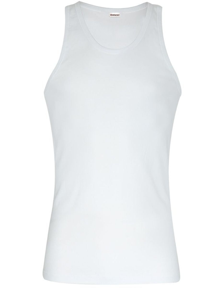 White men's singlet with round neck by Eminence. Made of 100% cotton and the singlet has no side seams. The singlet has a nice length, it reaches the top of the thigh so that it does not come out of the pants.