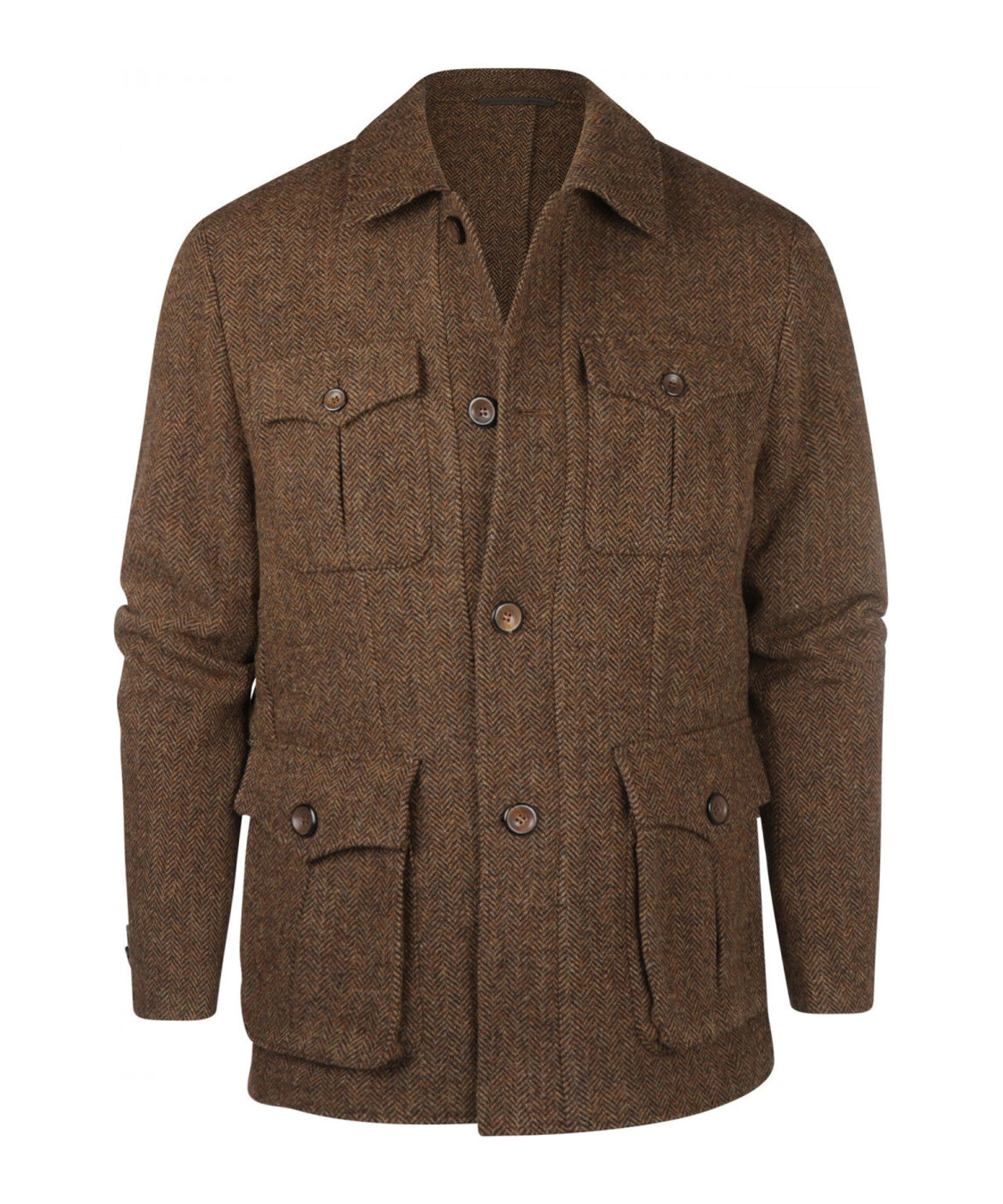 Beautiful sturdy tweed jacket, with 4 front pockets and a button closure. The jacket also has 2 inside pockets and is made of original British Tweed.