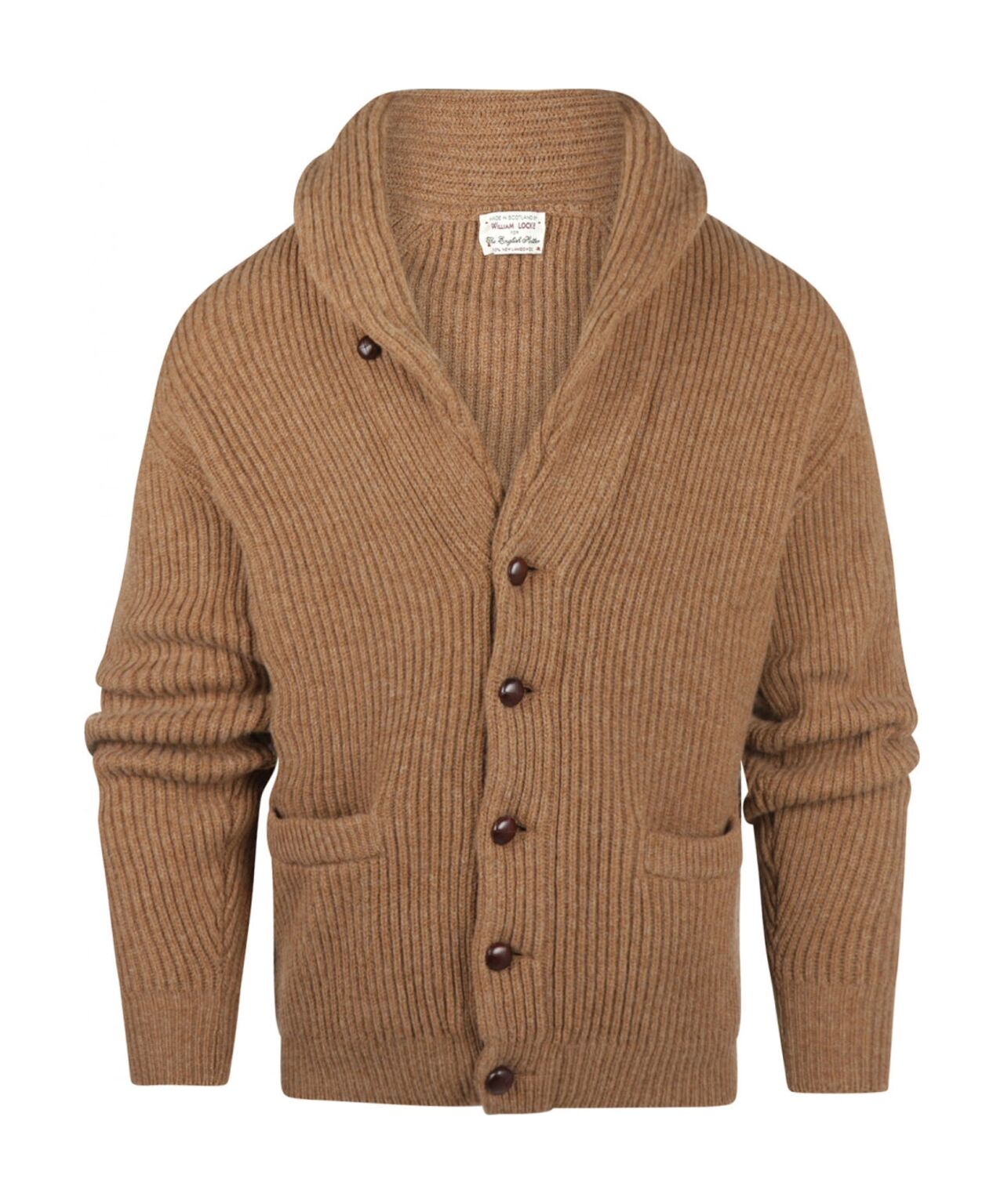 A warm and comfortable cardigan with shawl collar and raglan sleeves. The fit is quite traditional. The vest is made of 4 ply Geelong Lambswool, and has 2 pockets on the front.